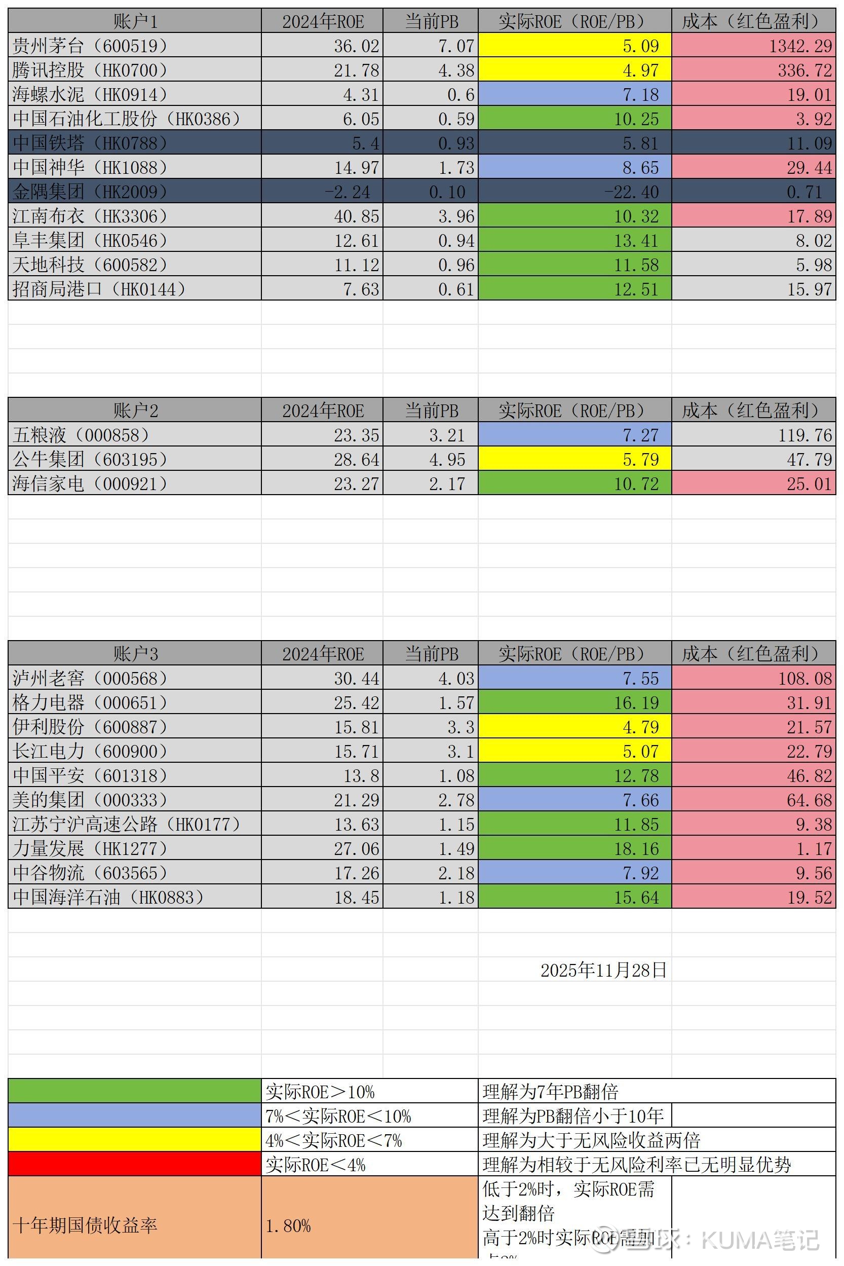 港口业务的商业模式是我比较喜欢的一种,一次建造,平时维护,躺着收费。既有稀缺性,又有垄断性。类似的行业还有高速公路。但是国内的高速公路目前的实际ROE都不是特别高,而且分红率及利润支付率也偏低。相比而言,同样的标的我买了三个高速公路REITS,分别是国金中国铁建、中金安徽交控、浙商沪杭甬,根据募集说明书,90%的利润将以分红形式发放,所以相比于高速公路股票,REITS让我对能够获得三条高速公路利润有更好的满足感。(以上三个REITS及部分指数/行业ETF未在下表中列明)。
