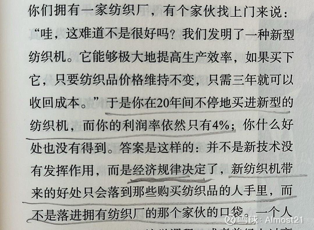 竞争性市场中技术进步的收益分配规律在充分竞争的市场中,技术进步带来的成本降低/效率提升,会通过“企业竞争降价”传递给消费者(即纺织品价格下降),最终技术收益由消费者而非生产者享有。制造业如何保持竞争优势,唯有自主研发核心技术!#穷查理宝典##格力电器#
