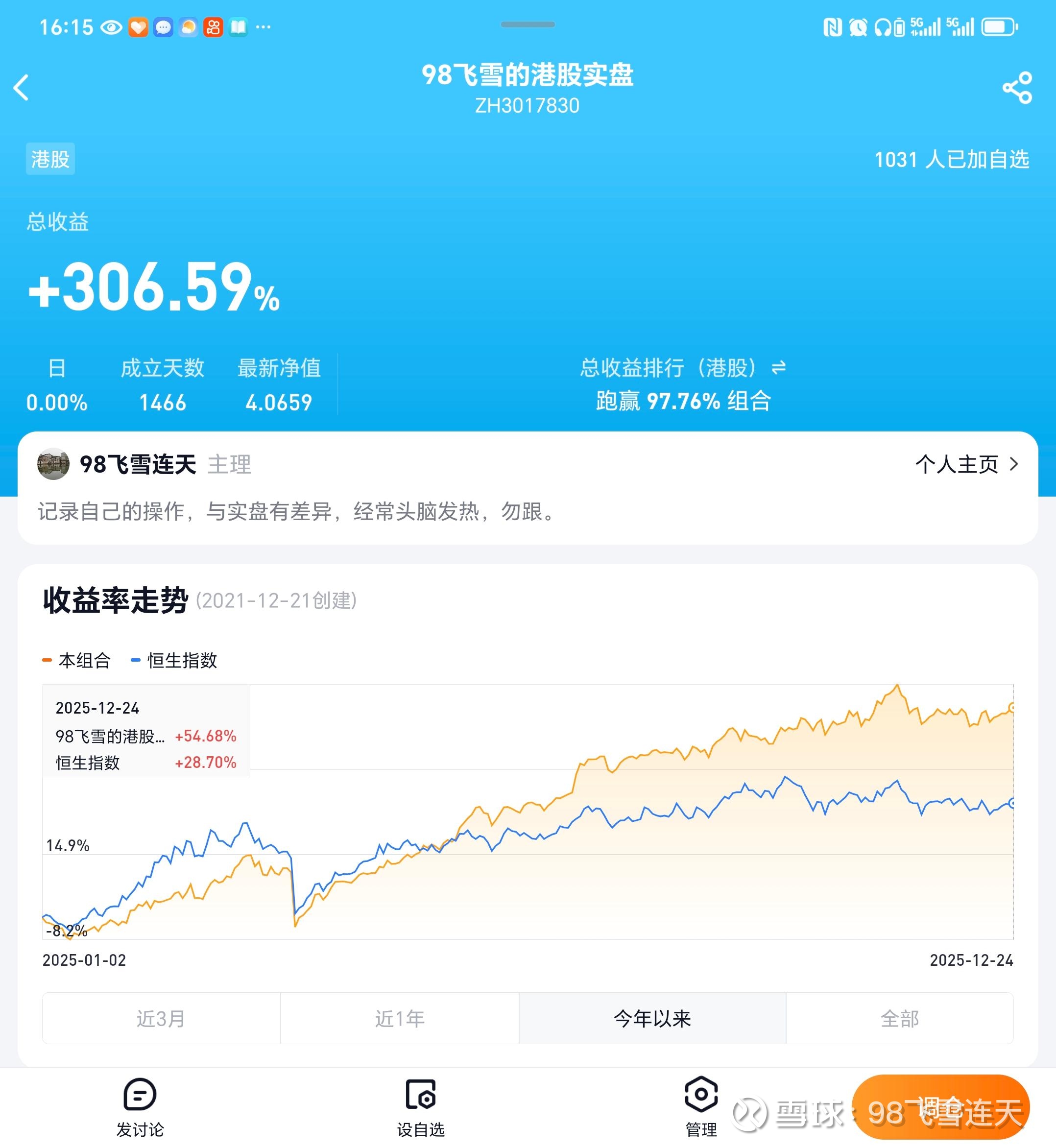 截至今日,2025年整体收益41.3%,恒生指数至今上涨28.7%,我的持仓里面接近90%是港股了,未来的对标就以恒生指数为基准。