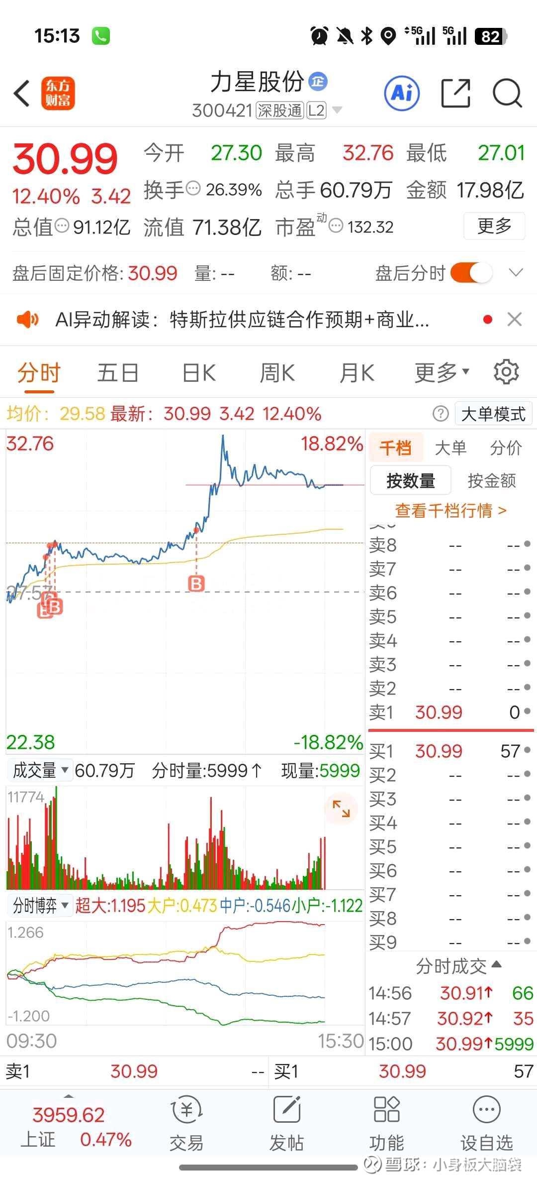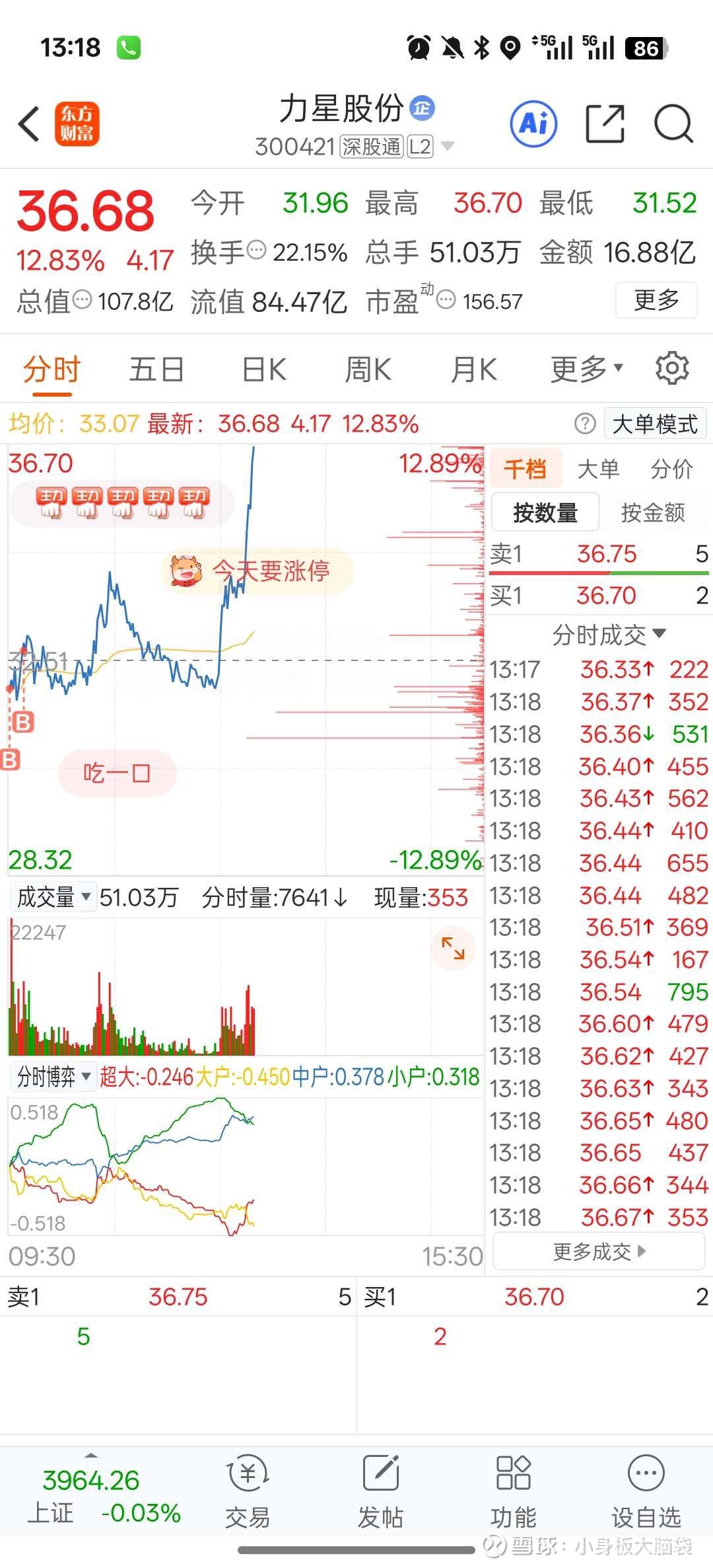 我比较喜欢机器人,所以选来选去选了力星股份,但这个股喜欢戏弄散户,一般人其实也不太好拿住,我是买了之后一路加仓,今天早盘创了新高后跌了一小时,不过没有吓到我,我心态好图片顺序就是我买入后一路加仓的过程。