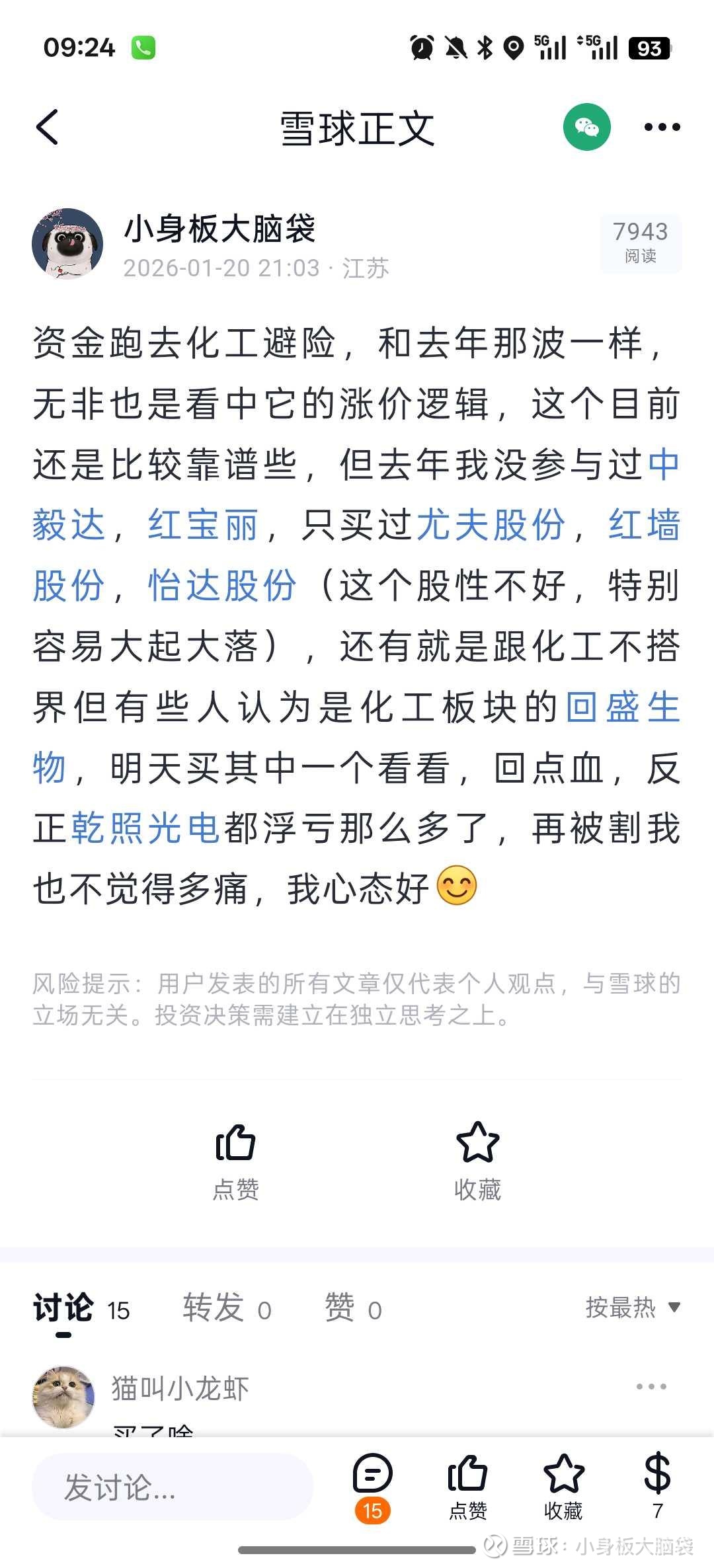 回复@叶轻愁: 20号想过化工,我确实也联想到红宝丽和其他几个,红宝丽它的辨识度很高,因为是上一次化工的主板领涨龙头,但是还是受制于十日涨幅限制,所以资金拉空间更多的百川,红宝丽尾盘才上板就没了龙头气质,但我并非说红宝丽不好,它前后对板块的作用是功不可没的,你买红宝丽没有错,如果红宝丽倒了,百川也不会好查看图片//@叶轻愁:回复@小身板大脑袋:化工龙头是红宝丽吧。我虽然也是周四打板的百川。但是觉得红宝丽妖气更足。