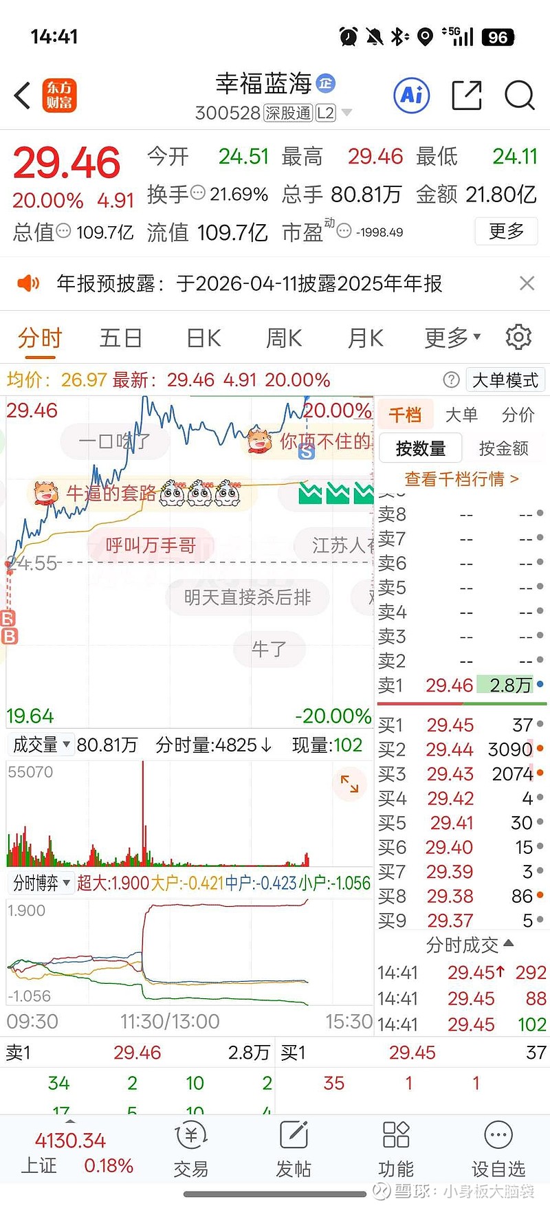 拼耐心拼到了,等到了回封,板上减了,仓位太重,我还是选择做T,比较稳妥。早上封板为什么不走,我说是因为回复太多信息,我没来得及看盘,不知道你们信吗