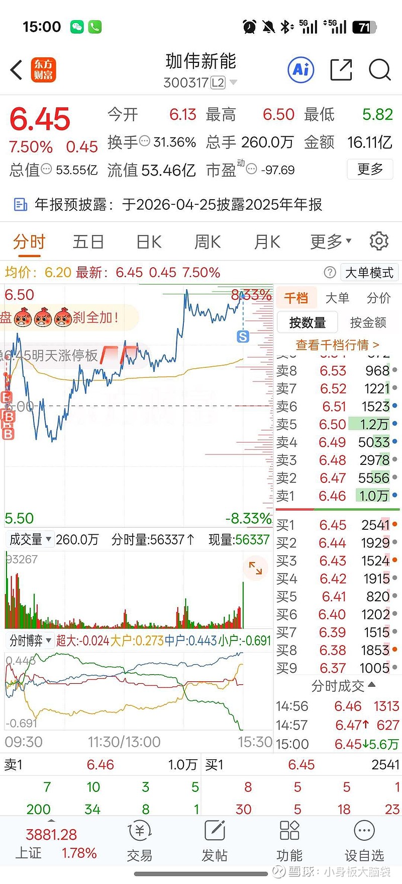 最后竞价减仓了一部分,你说我怂了也没关系,我买的实在太多了,我没办法,从早上最高浮亏129万,到现在浮盈80万多,坐了个过山车,心情从不嘻嘻到嘻嘻,暂时不用吃馕了。