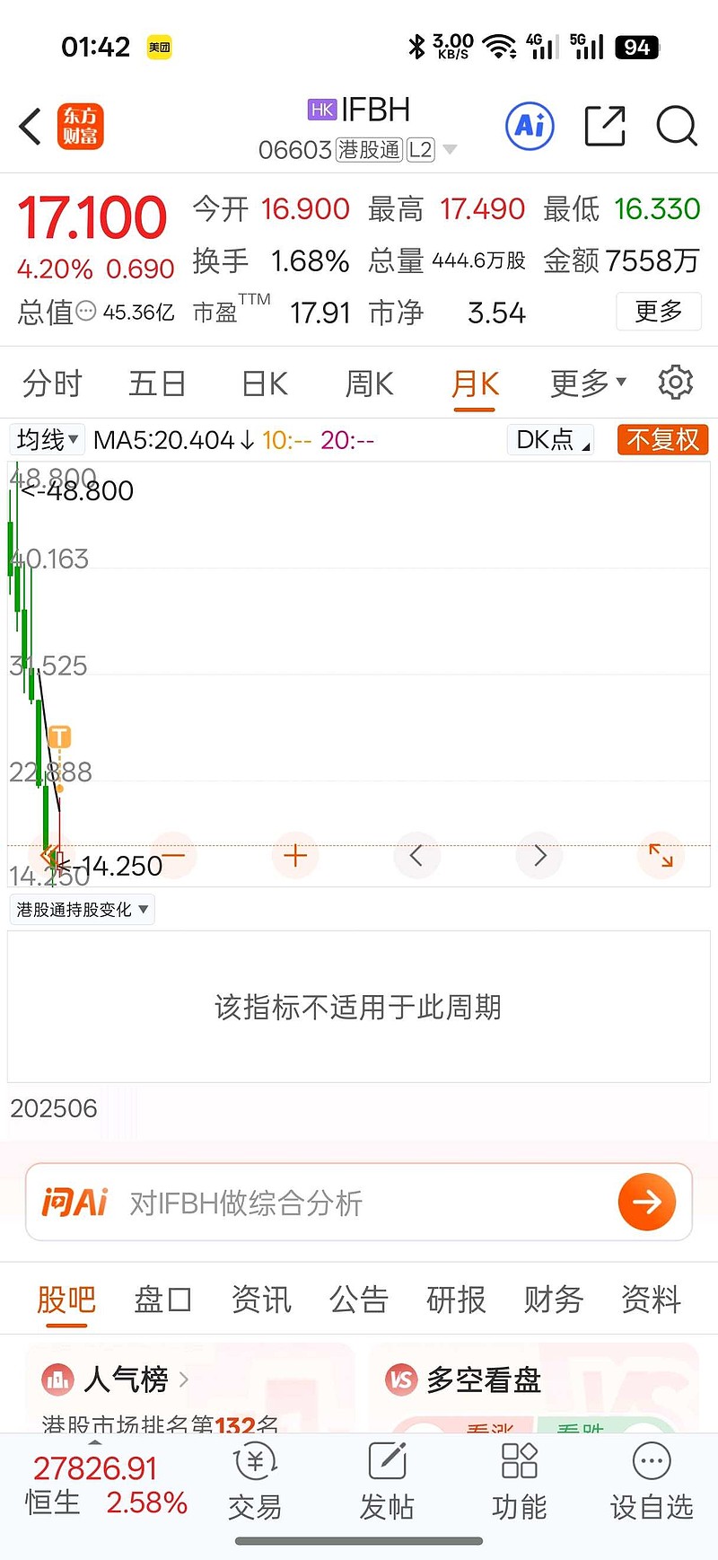 今天发帖有人叫我删帖。想想就删了吧。今天IFBH回本后超过荣昌生物成为第一重仓,荣昌生物亏太多退到第二了。不知道为什么对IFBH很有信心能翻倍,猜7月份,暑假开始时,22.88,31.52,40.16三个关口,2月份涨到22.88,接下来业绩公布继续回购涨到31.52,分红暑假业绩暴涨涨到40.16,剧本写好了,慢慢熬吧。