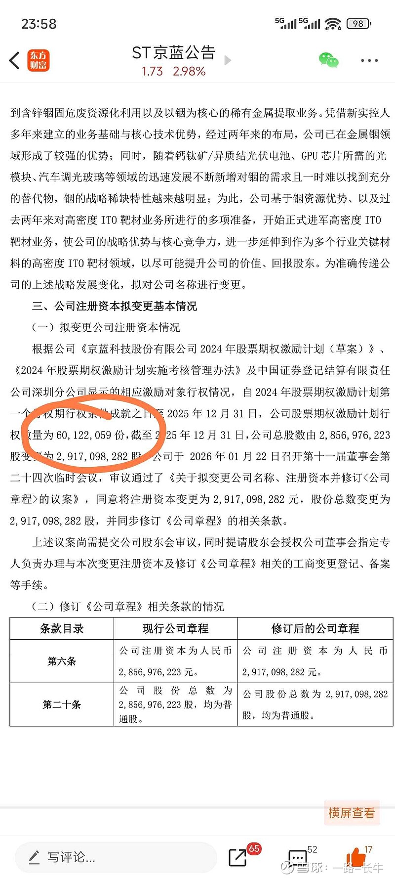 $ST京蓝(SZ000711)$ 前阵子我发了关于总股本变动的帖子,说了是公司层面在行权导致,现在实锤了。今天的公告,两个利好,一是改名稀有金属名称,进一步与鑫联科技靠拢,二是高管1.83价格行权托底,所以真的未来可能很难再有2元以下的稀有金属股了$*ST亚太(SZ000691)$ $*ST东易(SZ002713)$