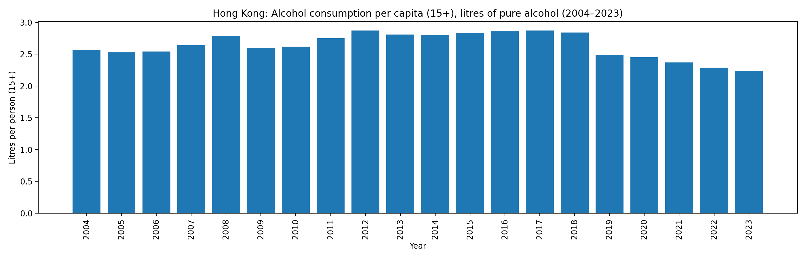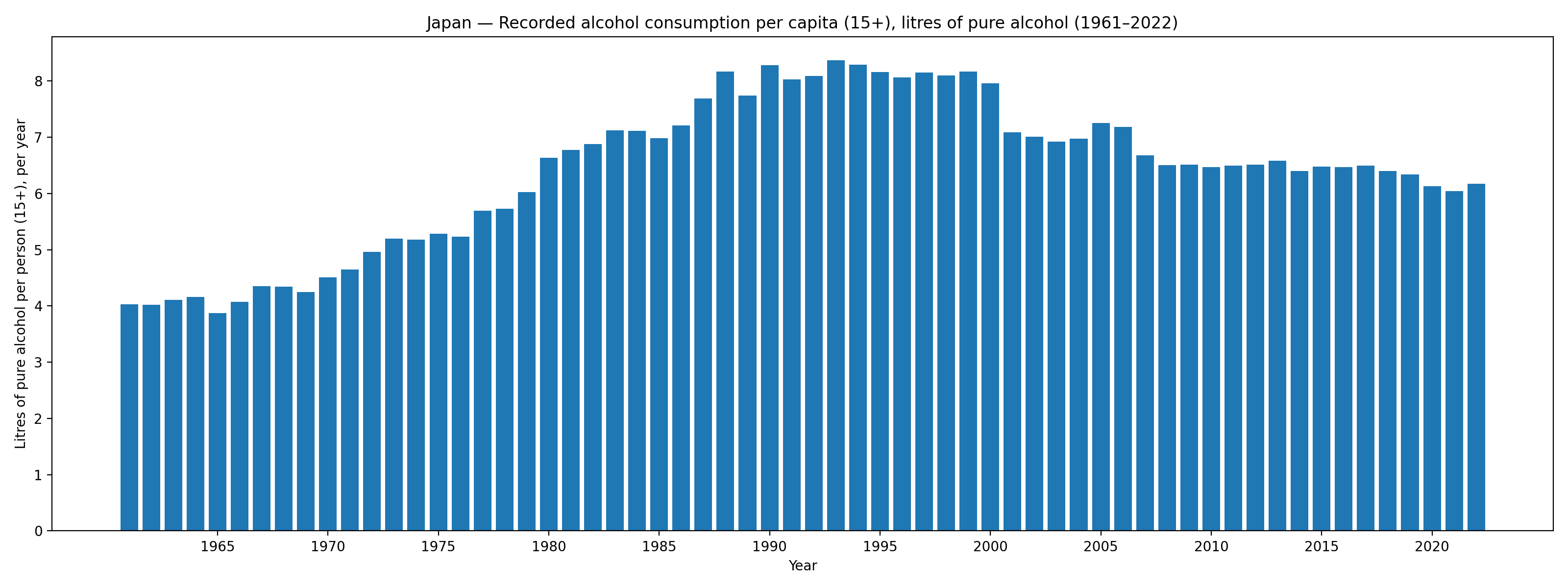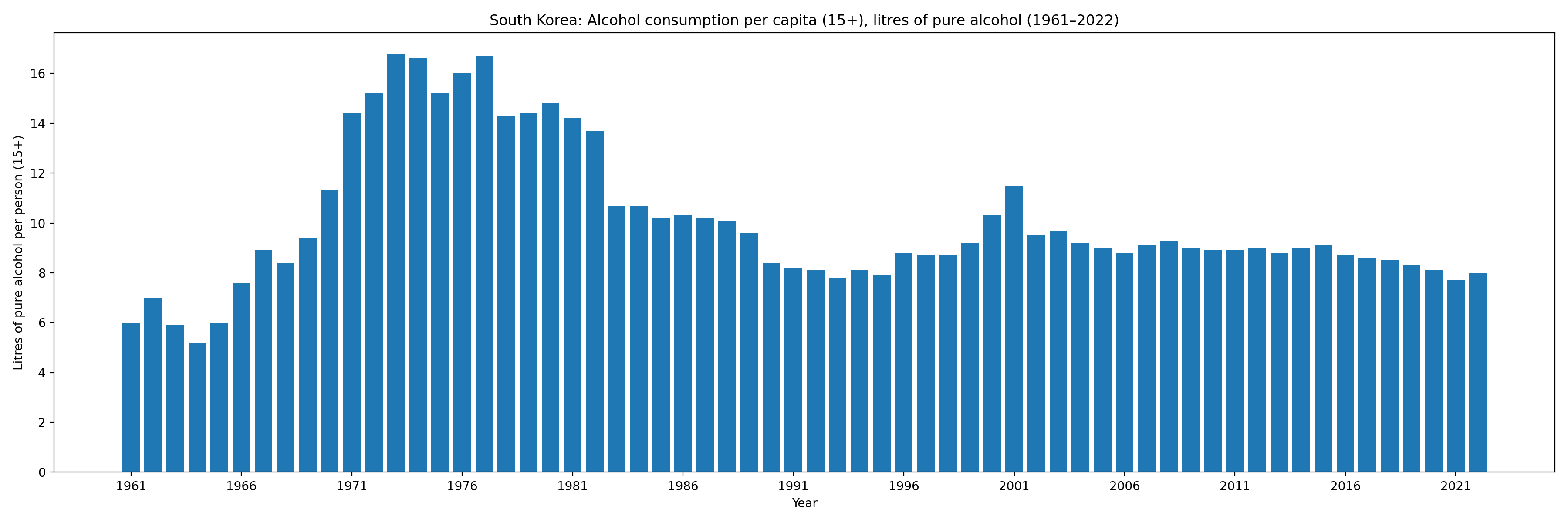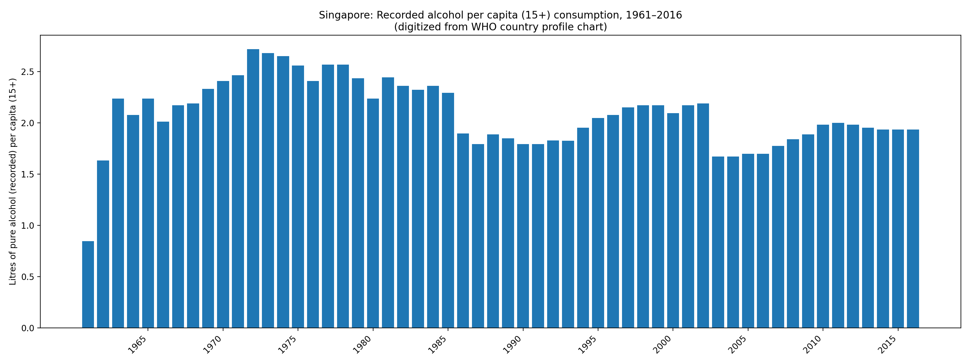我们拿和国内文化习俗有相似之处的几个东亚国家和地区:分别是日本、韩国、新加坡、中国香港尽可能长周期的人均酒精消费量的数据来看下;