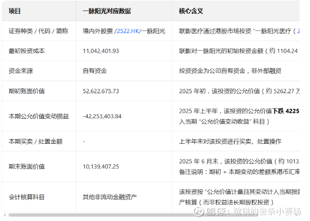 2025 年上半年,一脉阳光港股股价下跌,导致联影确认了4225.34 万元的公允价值变动亏损,直接影响当期利润。