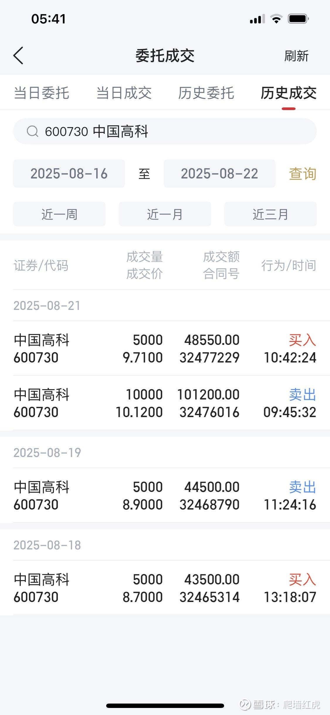 $中国高科(SH600730)$ 10.12元卖10000股,9.71元买5000股。2015年4月3日建仓中国高科,2015年5月27日上涨到最高点44.33元,下跌后,2015年11月13日,再次反弹到39.40元。可惜在盈利40多万的情况下,我都没有撤离,之后便开始了补仓打抽的漫长回本之路。历经10多年,截止到2025年8月19日,持仓65900股,成本9.8061元。但单笔买入价都比2025年8月22日涨停价10.13元高,10.62元5900股,11.40元20000股,12.51元5000股,12.86元5000股,12.94元5000股,12.96元5000股,13元5000股,13.08元5000股。15.61元2000股,15.81元3000股。不想轻易放弃,雪球上的股友有持仓时间比我还长,股价比我还高的吗?