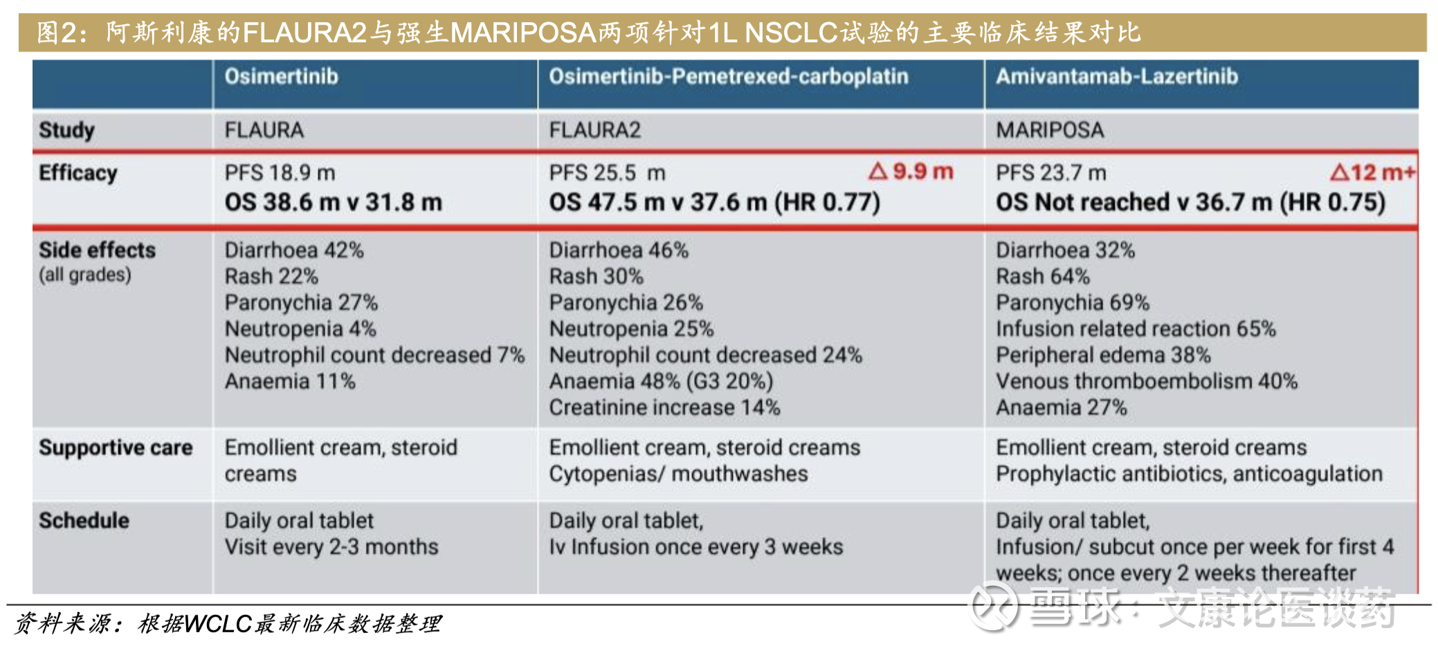 这些带给肿瘤研发企业更大的挑战,临床端对照组的设计以及样本人群背景的考虑。从阿斯利康和强生的例子,针对同一类mNSCLC肺癌人群,除了比较整体的临床数据,亚组分析也成为临床选择的侧重考量;疗效以外,医生及患者也更加关注安全性的平衡,比如化疗药物的使用时长及不良反应的管理。