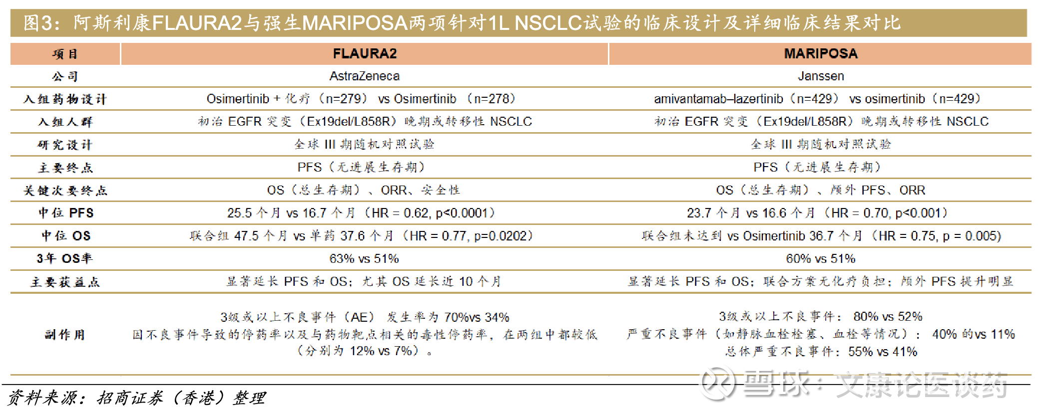 2. MARIPOSA试验(NCT04487080):三代TKI+EGFR/cMET双抗联合,无化疗方案Amivantamab联合Lazertinib对比osimertinib,HR 0.75,3年OS率60% vs 51%。