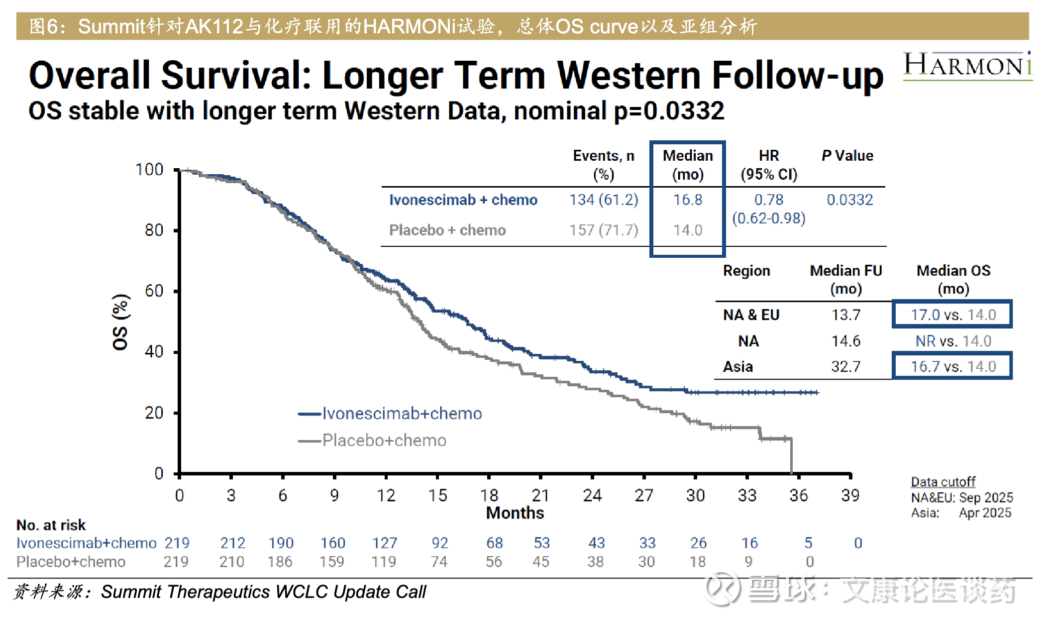 该全球临床的OS数据,首次在WCLC上亮相,整体患者中试验组OS中位16.8个月 vs 对照组14.0个月,基于西方患者(NA&EU)中位随访13.7个月,亚洲患者约32.7个月。试验组(ivonescimab联合化疗组)中位PFS 6.8个月 vs 对照组(单独化疗组)4.4个月,主要分析HR 0.52(p<0.0001);更长随访HR 0.57。长期随访PFS(LTF PFS),整体获益趋势和第一次初步分析的一样,北美+欧洲HR 0.67,一方面PFS获益可能确实比亚洲差一点,另一方面也是受制于这部分人群样本量小,样本量小的情况下,HR很难做的很漂亮。