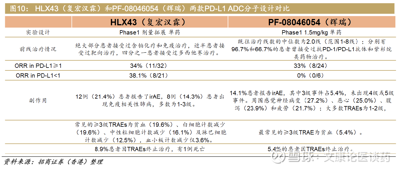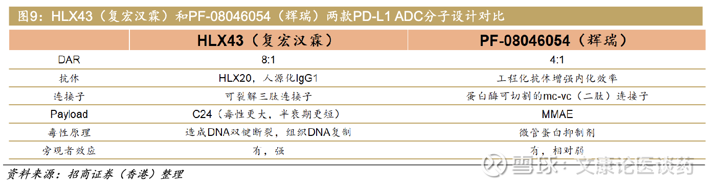 PD-L1在多种肿瘤类型中广泛表达,不具备分泌性,通常表达于肿瘤浸润免疫细胞,并在与单克隆抗体结合后发生内化,这些特性使其成为抗体药物偶联物(ADC)开发的一个极具吸引力的靶点。目前有两个PD-L1 ADC药物进入临床,PF-08046054(辉瑞)和HLX43(复宏汉霖),二者都是用PD-L1抗体连接毒素,旨在免疫治疗的过程中精准的杀灭癌细胞。虽然二者看似形式相同,但在药物设计上却有大不同。下表是两个分子在设计上的比较: