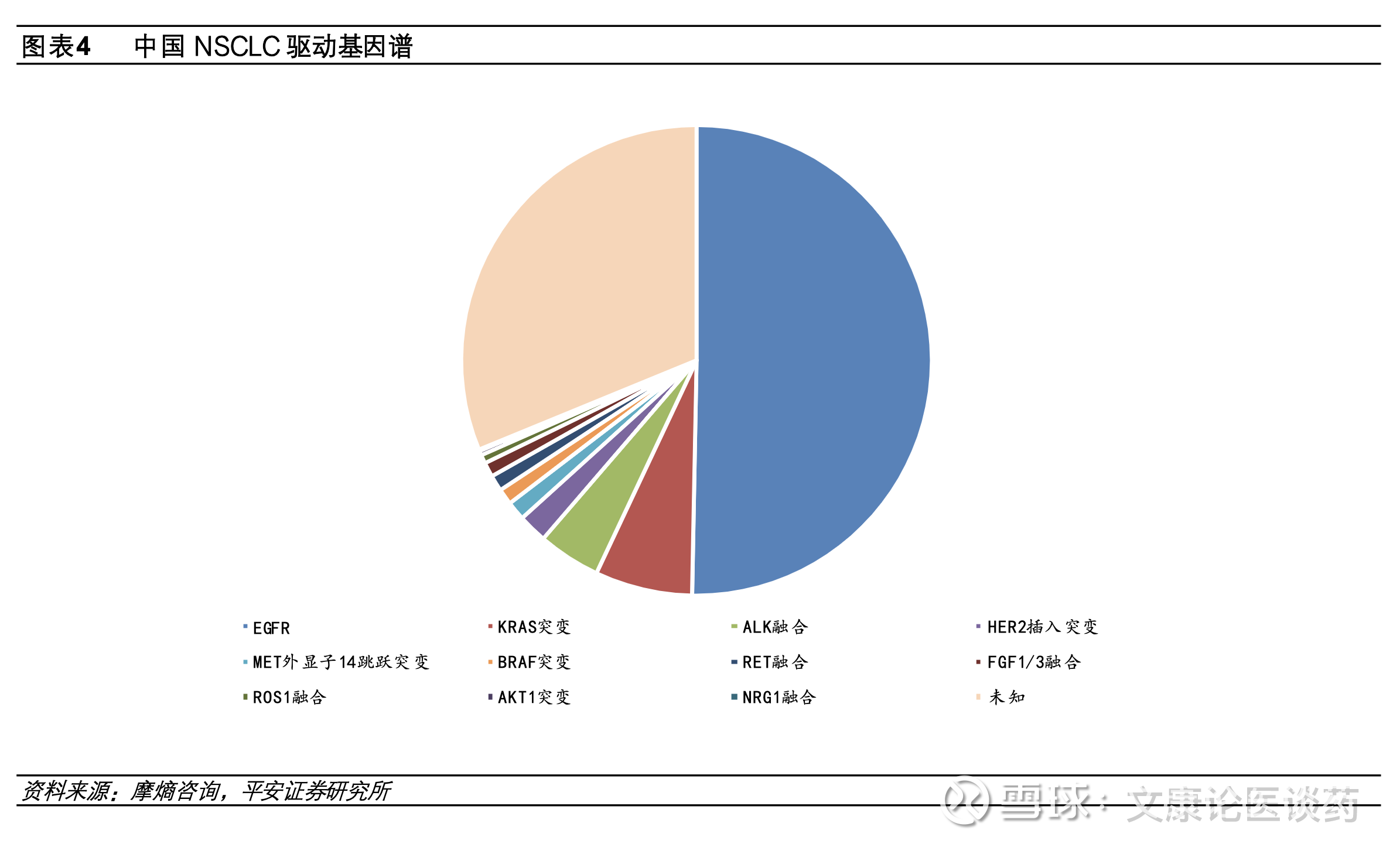 国内NSCLC突变类型主要为EGFR突变。肺癌的分子发病机制复杂且具有异质性,其发生发展可有多种遗传因素和表观遗传改变(如点突变、扩增、插入、缺失、易位)共同导致。从基因分型来看,EGFR、KRAS和ALK是中国NSCLC患者最常见的突变类型,2016年复旦大学附属肿瘤医院团队在《Oncotarget》上,发表了一项对1770例手术切除NSCLC样本(1305例为肺腺癌)的回顾性分析,显示中国EGFR、KRAS和ALK仍为NSCLC患者中最常见的三种突变,占比在整体人群中分别为50.3%、6.7%和4.3%。此外EGFR突变在中西方患者的突变频率不同,在白种人群中,NSCLC携带EGFR激活突变比例在10-20%,而对应在亚洲人群约50%的NSCLC患者携带EGFR激活突变。