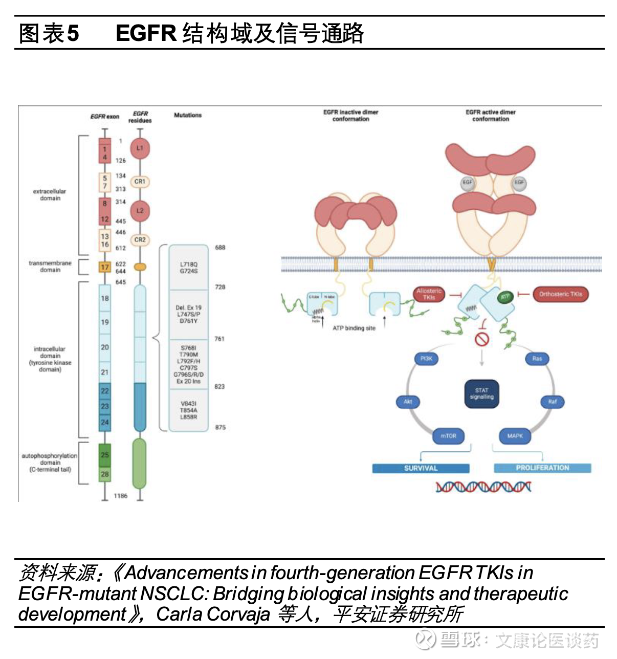 纵观一二三代EGFR TKI发展,第一代TKI如吉非替尼、厄洛替尼可逆性的针对表皮生长因子受体酪蛋白结构域的ATP结合位点,从而抑制表皮生长因子受体自磷酸化和随后下游信号激活,将mPFS从标准方案的铂类化疗4-6个月延长至9-13个月;第二代TKI阿法替尼、达可替尼通过与ERBB家族不可逆结合,将一线治疗mPFS延长至11-14个月;第三代TKI选择性的抑制携带常见突变和/或T790M突变,mPFS在18.9-22.1个月,与一二代TKI相比,第三代TKI与野生型EGFR相关的不良事件如皮疹和腹泻发生率较低,整体来看每一代EGFR TKI小分子抑制剂的疗效呈现出对应的“平台期”特征,而三代TKI对EGFR突变NSCLC患者整带来体生存获益的提升。