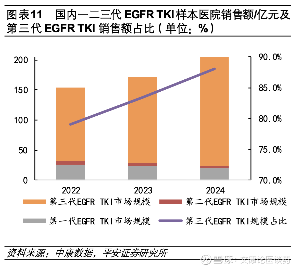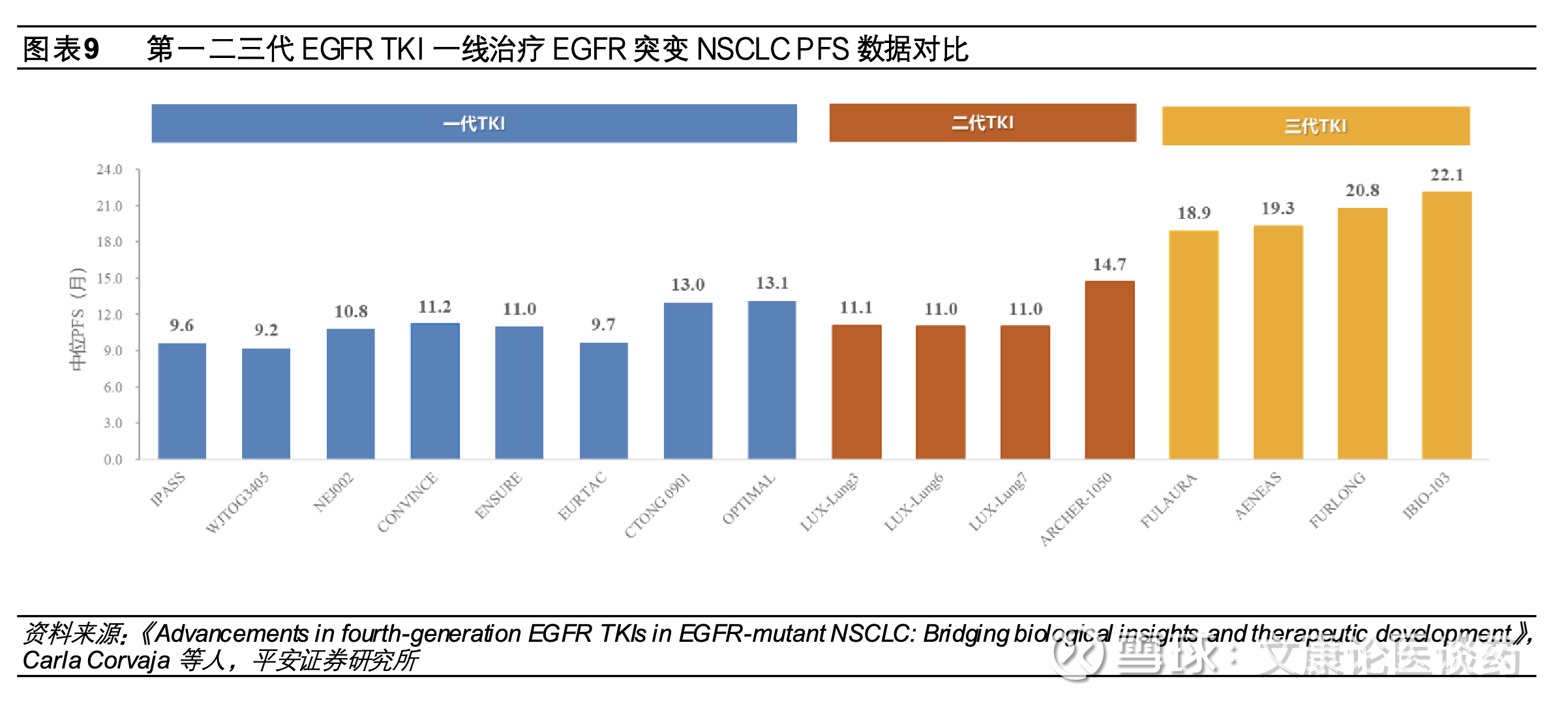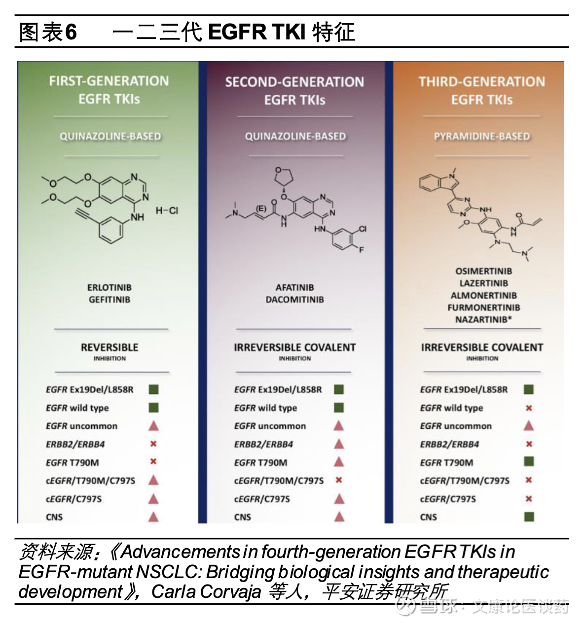 ◼ 第三代EGFR TKI已成为晚期EGFR突变NSCLC一线标准疗法。EGFR TKI的发展从第一代到第三代,持续推动晚期 EGFR 突变非小细胞肺癌(NSCLC)患者生存期的延长。目前第三代EGFR TKI凭借其卓越的疗效与良好的安全性,已成为该群体一线治疗的标准方案。第一代TKI(如吉非替尼、厄洛替尼)通过可逆性地作用于 EGFR 酪氨酸激酶结构域的ATP结合位点,抑制EGFR自磷酸化及下游信号通路,将中位无进展生存期(mPFS)从传统铂类化疗的4–6个月提升至9–13个月。第二代TKI(如阿法替尼、达可替尼)则通过与 ERBB 家族不可逆结合,进一步将mPFS延长至11–14个月。第三代TKI能够选择性抑制常见EGFR突变及T790M耐药突变,在临床研究中取得18.9–22.1个月的mPFS,显著优于前两代药物。在安全性方面,第三代TKI对野生型EGFR的影响较小,皮疹、腹泻等不良事件发生率较低,展现出更好的耐受性。总体来看,每一代EGFR TKI的疗效均呈现出相应的“平台期”特征,而第三代药物在整体生存获益上实现突破,目前已成为晚期EGFR突变NSCLC一线治疗的首选。