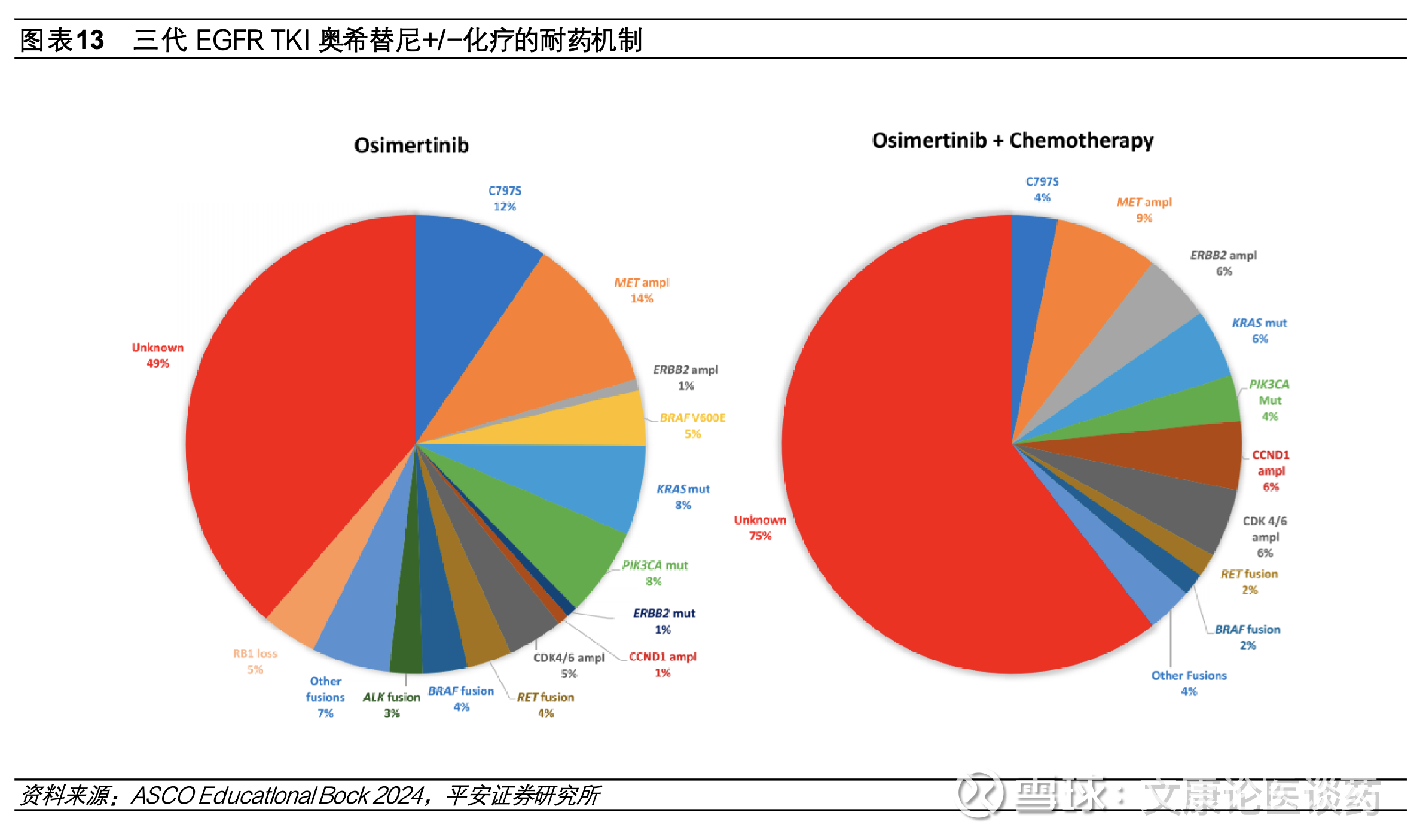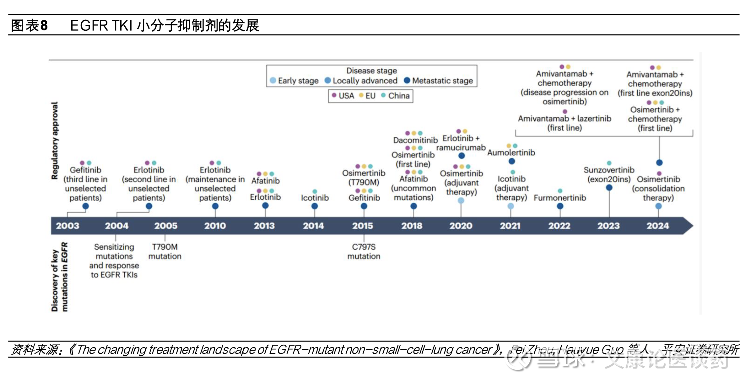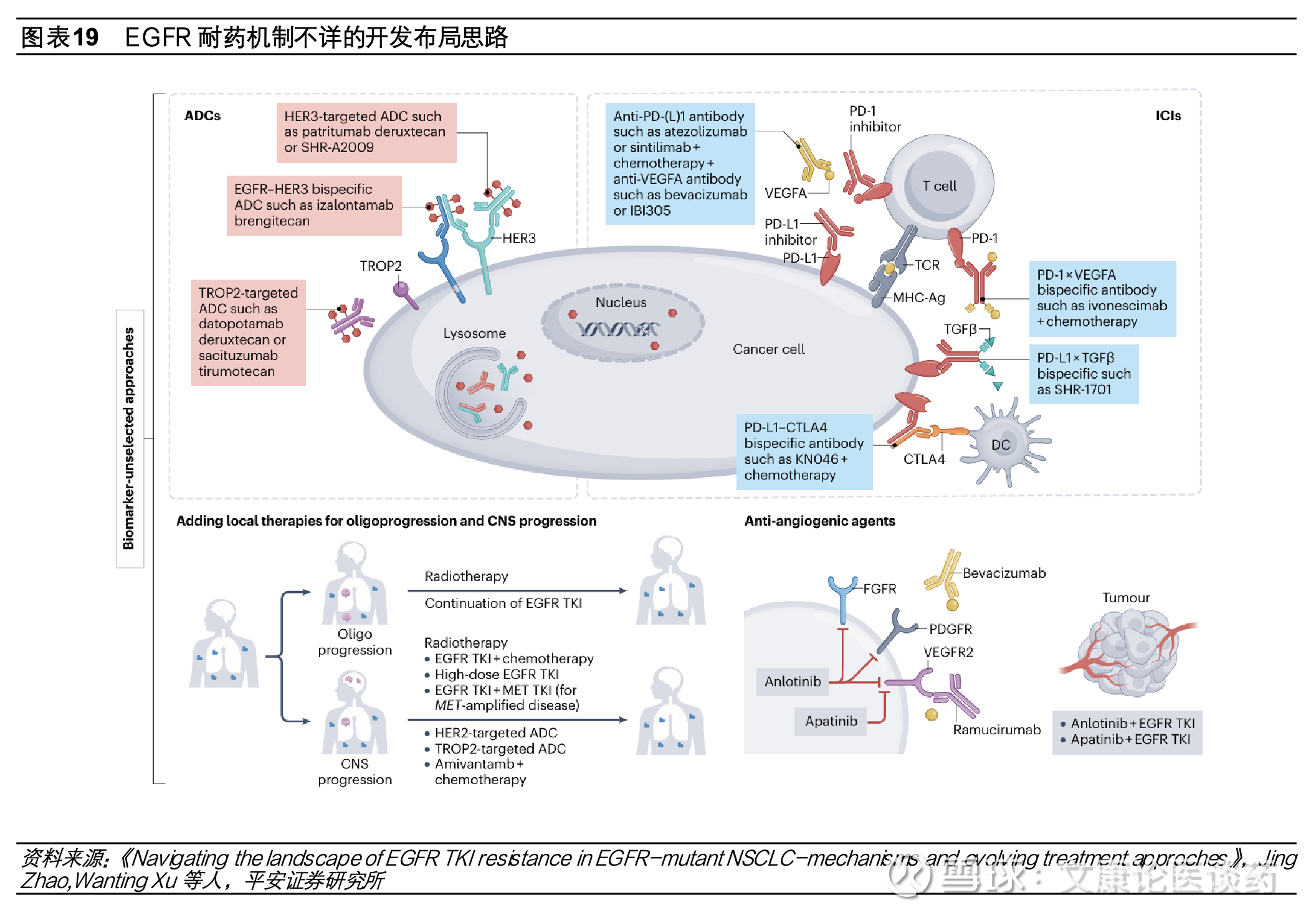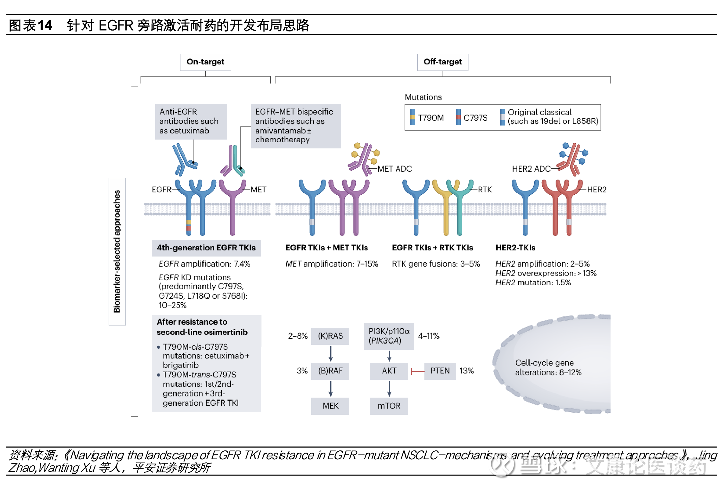 ◼ 三代EGFR TKI耐药后疗法亟需破局,国内第四代EGFR TKI、双抗、ADC等方案积极探索。尽管第三代EGFR TKI在疗效和安全性方面表现优异,但耐药性的出现仍会导致疾病进展。接受第三代药物治疗的患者,其耐药机制较为复杂,主要包括EGFR依赖性机制(如EGFR C797S突变、T790M丢失等)以及EGFR非依赖性机制(如Met扩增、HER2扩增等替代信号通路的激活)。数据显示在二线和一线使用奥希替尼治疗后出现疾病进展的患者中,分别约有14%和7%发生C797S耐药突变。为克服EGFR TKI耐药,目前主要的研究方向包括:(1)开发针对EGFR依赖性耐药突变的第四代EGFR TKI小分子药物,目前整体仍处于早期探索阶段;(2)针对替代信号通路激活,已有EGFR/c-Met双抗(如埃万妥单抗)及c-Met ADC等药物取得重要突破;(3)针对未明确的耐药机制,目前布局的策略包括TROP2 ADC、HER3 ADC、免疫检查点抑制剂联合抗血管生成药物及化疗、PD-1/VEGF双抗等。在第三代EGFR TKI耐药后的联合治疗、双抗及ADC药物的探索中,国内药企正扮演越来越重要的角色,地位日益凸显。