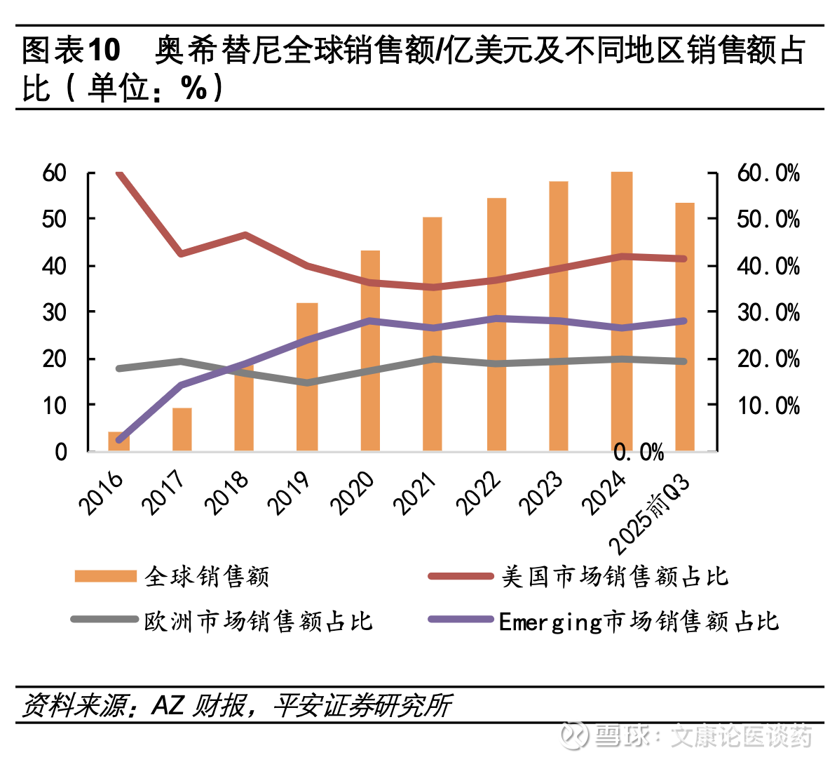 ◼ 第三代EGFR TKI国内外市场规模放量及市占率持续提升。2024年国内EGFR TKI市场规模突破200亿元,三代EGFR TKI占比高达88%。作为首个获批的第三代EGFR TKI,奥希替尼自2015年在美国加速获批以来,全球销售额持续增长。2024年其全球销售额达65.8亿美元,从区域分布来看,奥希替尼美国市场贡献全球销售额42.0%,欧洲市场占19.8%,新兴市场(包括中国)占 26.7%,奥希替尼在 EGFR 突变非小细胞肺癌(NSCLC)一线治疗中的优势,是其商业成功的基础。国内市场来看,2024年中国EGFR TKI市场总销售额突破204.4亿元,同比增长19.5%。其中第三代EGFR TKI(包括奥希替尼、阿美替尼、伏美替尼等)贡献了179.9亿元,占整体市场的88%,标志着三代药物已确立市场核心地位。