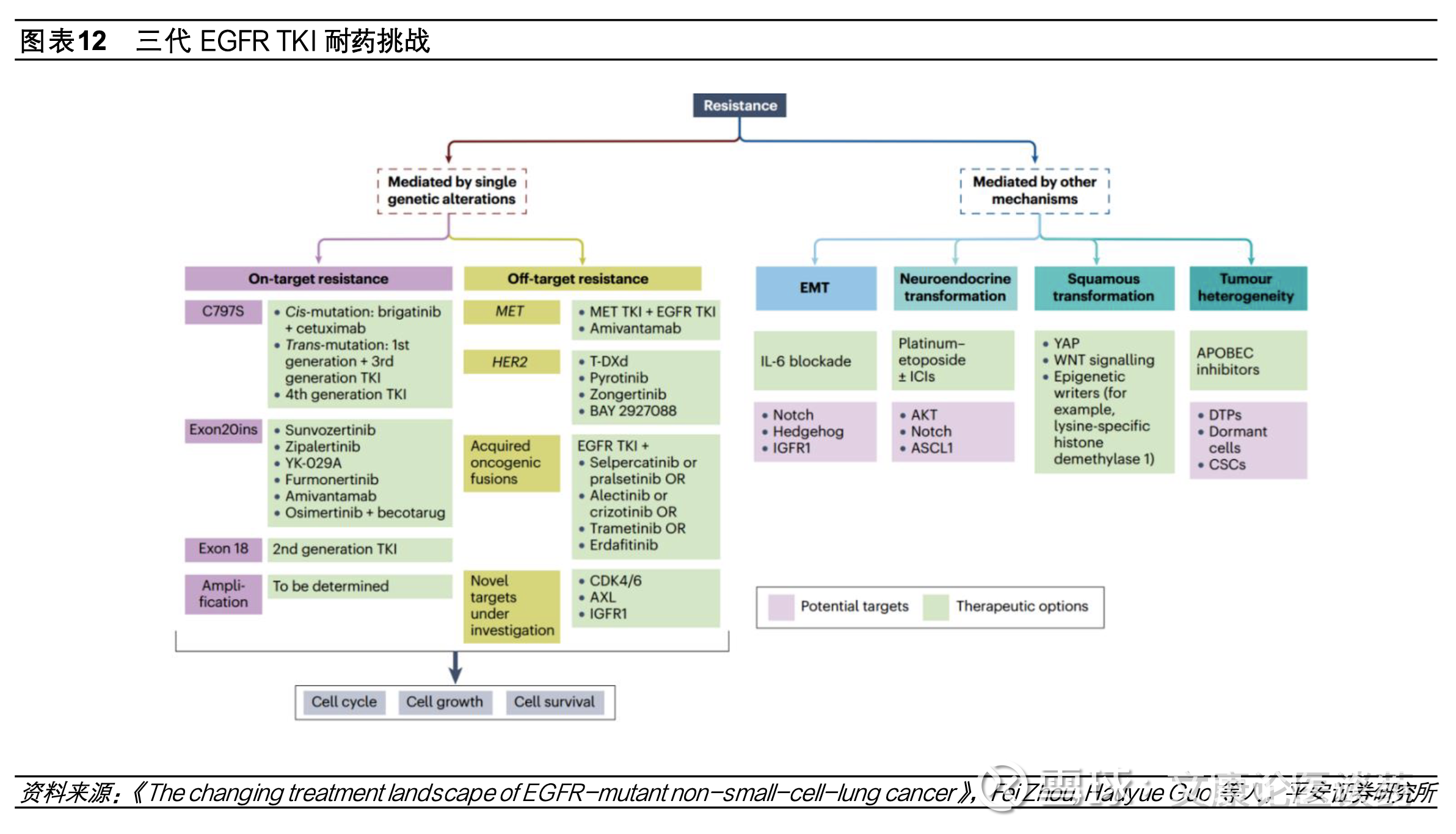 三代EGFR TKI耐药后挑战亟需破局,第四代TKI、双抗、ADC等研发布局。尽管第三代EGFR TKI疗效显著且安全性良好,但由于耐药性的出现疾病仍会发生进展,目前EGFR TKI耐药后疾病进展的标准治疗方案是化疗,中位mPFS在4.4-5.5个月,临床疗效有限并伴有严重全身性不良反应。第三代EGFR TKI用药患者出现耐药机制复杂,可能涉及EGFR依赖性(如EGFR C797S突变、T790M的丢失等)和EGFR非依赖性(替代信号通路旁路激活Met扩增、HER2扩增等)机制。疾病进展时,分别约有14%和7%接受二线和一线奥希替尼治疗患者出现C797S耐药突变。为了解决EGFR TKI耐药问题,目前开发思路主要有(1)针对EGFR依赖性耐药突变开发第四代EGFR TKI小分子;(2)针对EGFR信号通路旁路激活采取联用小分子抑制剂或开发双抗等;(3)针对机制未明的EGFR耐药探索双抗、ADC等。