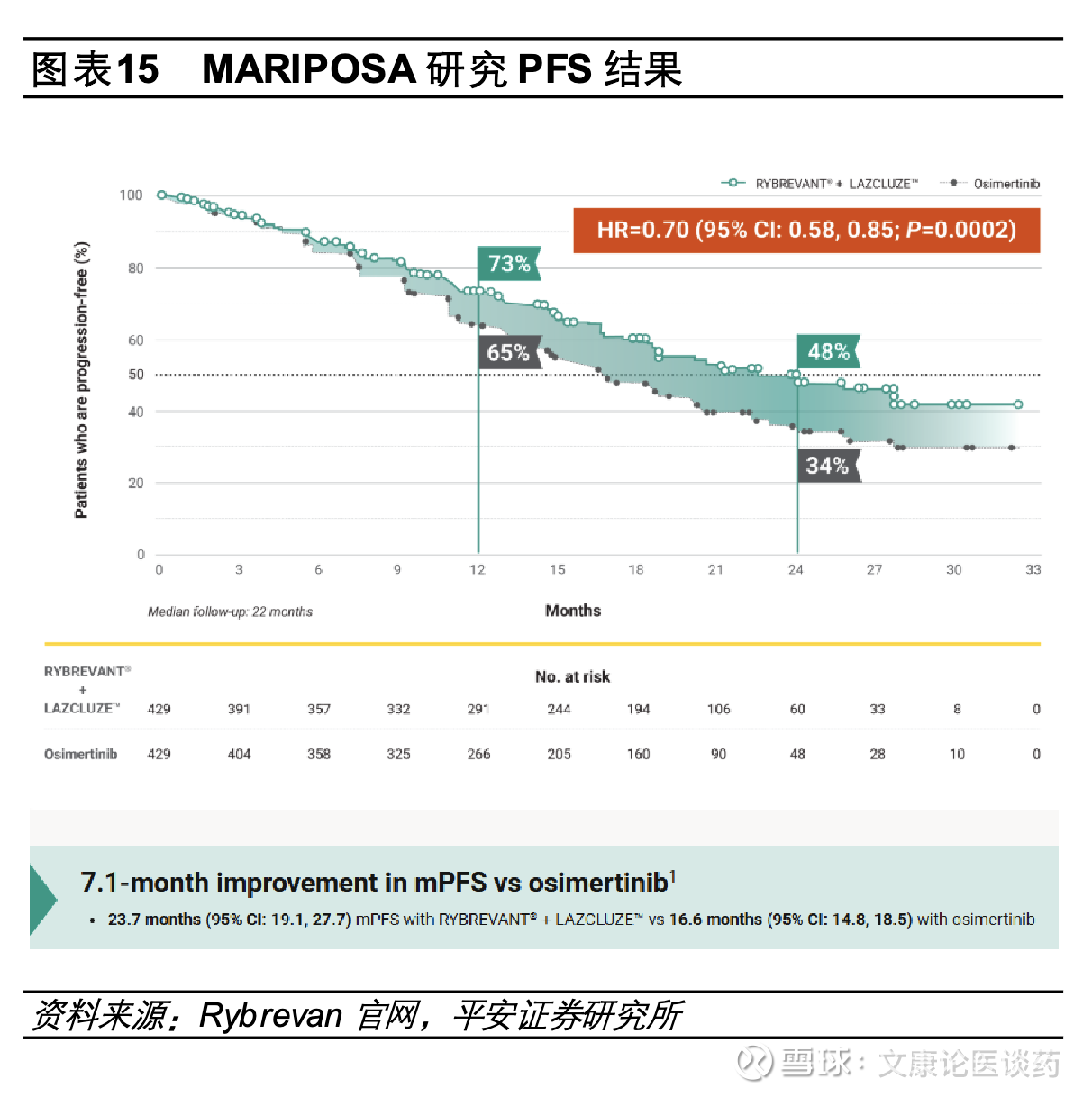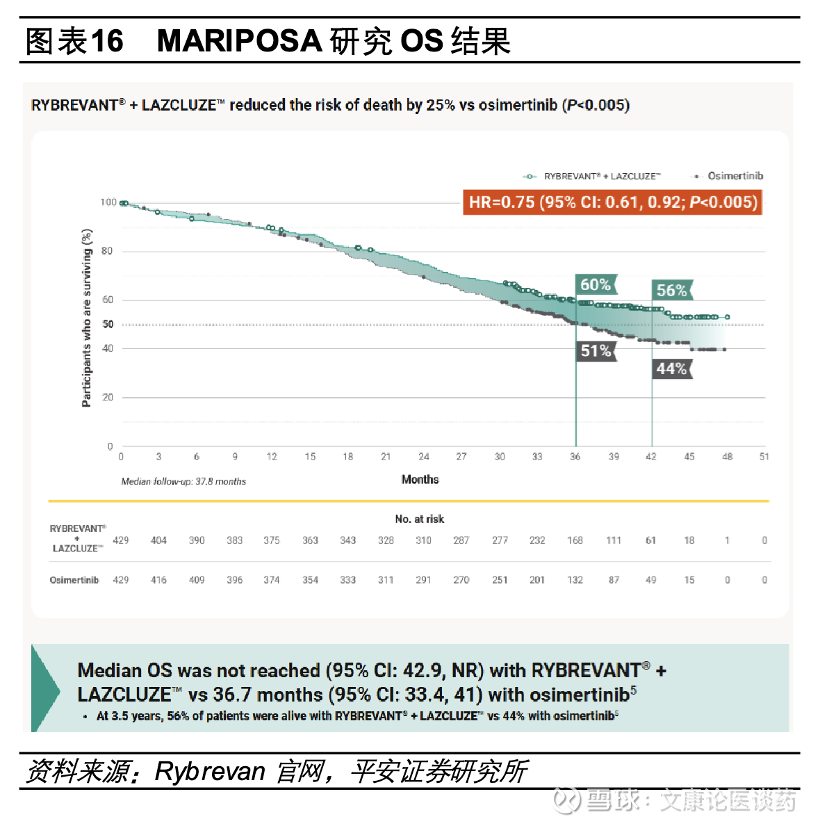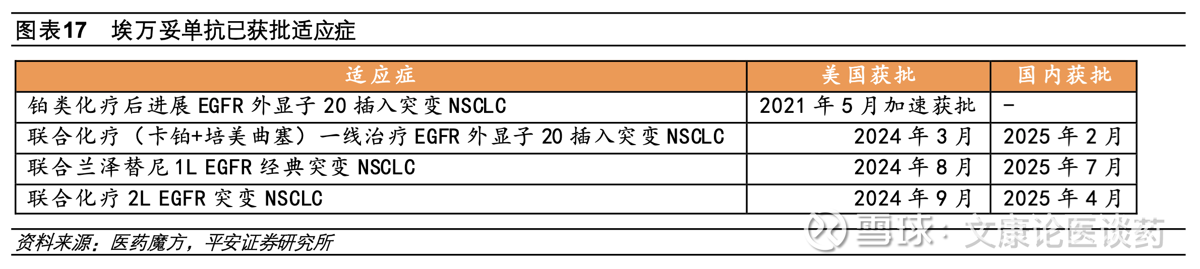 ➢ EGFR/c-Met双抗埃万妥联合兰泽替尼为不可耐受化疗/拒绝化疗EGFR突变NSCLC患者提供“Chemo-Free”的新治疗模式。2025年8月基于MARIPOSA研究,埃万妥单抗联合兰泽替尼国内获批1L EGFR 19号外显子缺失或21号外显子L858R置换突变NSCLC,研究结果显示,对比奥希替尼单药组,埃万妥单抗联合兰泽替尼mPFS显著延长(23.7个月 vs 16.6个月,HR=0.7),2025年ELCC会议上公布的最新OS数据显示中位随访37.8个月,埃万妥单抗关联和兰泽替尼的OS较奥希替尼明显改善,相较于奥希替尼组mOS为36.7个月,埃万妥单抗联合兰泽替尼的mOS尚未达到,且生存曲线呈现长拖尾效应。