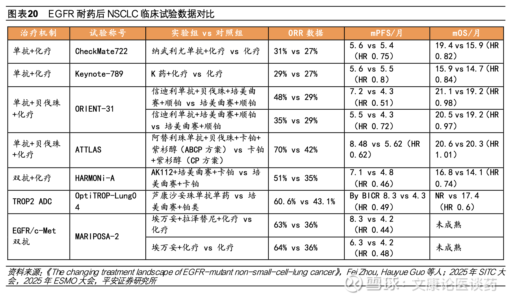 尽管EGFR TKI耐药后可通过再次活检来确定耐药机制,但仍有部分患者耐药机制不明,针对未明确EGFR耐药机制的布局有TROP2 ADC、HER3 ADC、免疫检查点抑制剂联合抗血管生成和化疗、PD-1/VEGF双抗联合化疗等。在三代EGFR TKI耐药后联用、双抗、ADC等探索中,国内药企的地位和重要性越来越凸显,具体相关研究描述如下:(1)信达生物的ORIENT-31研究采用信迪利单抗联合贝伐和化疗四药联合治疗EGFR TKI耐药非鳞状NSCLC患者,研究结果表面四药联合治疗对比单纯化疗延长患者 PFS,但中位 OS 未取得获益;(2)康方生物 HARMONi-A 研究实验组采取依沃西单抗(PD-1/VEGF双抗)联合化疗对比安慰剂联合化疗,显著延长患者PFS;(3)科伦博泰OptiTROP-Lung04研究为SKB264单药(TROP ADC)对比化疗,结果表明显著延长PFS,且OS期中分析显示与含铂双药化疗相比,SKB264显著改善OS,死亡风险降低40%。
