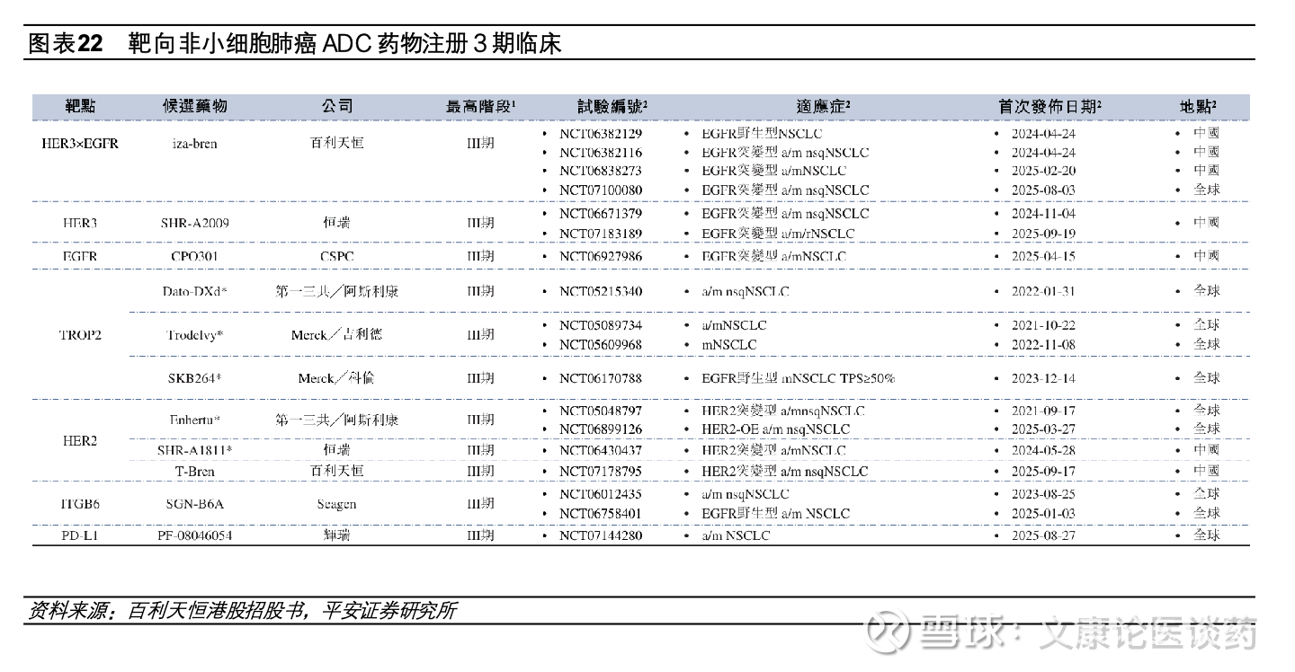 ◼ 投资建议:肺癌作为全球及国内最常见的恶性肿瘤之一,2024年全球新发病例约260万,其中中国新发约115万例。在非小细胞肺癌(NSCLC)中,EGFR突变是主要基因亚型,尤其值得关注的是其在亚洲人群中的高发情况—约50%的NSCLC患者携带EGFR激活突变,显著高于白种人(10–20%)。这一庞大患者群体推动了三代EGFR TKI药物的快速放量,同时,针对三代TKI耐药后的治疗策略也已成为研发热点,当前布局方向包括免疫联合抗血管治疗、第四代EGFR TKI、ADC、双抗及双抗ADC等多元路径。(1)三代EGFR TKI的持续放量:重点关注翰森药业(阿美替尼)及艾力斯(伏美替尼)等已上市品种的市场渗透与销售增长。(2)ADC 与双抗类药物进展:科伦博泰 TROP2 ADC 全球及国内注册临床进展;百利天恒EGFR/HER3 双抗ADC(已进入临床III期);康方生物/SUMMIT PD-1/VEGF双抗;三生制药/辉瑞PD-1/VEGF双抗;信达生物在PD-1/IL2 IO2.0及ADC领域的多元布局;映恩生物多款ADC管线的研发进展等。(3)第四代EGFR TKI的研发突破:关注迪哲医药、翰森制药、和誉医药等在四代TKI领域临床进展。