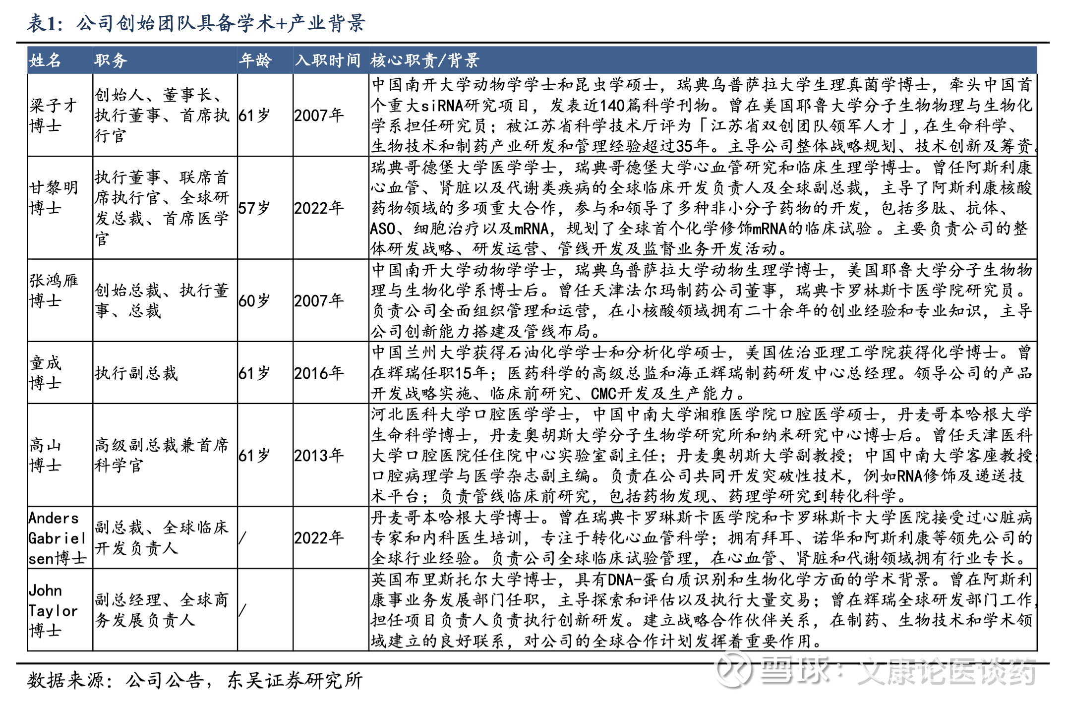 创始团队具备学术+产业背景。团队成员兼具跨国制药企业高管经验、学术科研背景及资本市场运作能力,其中多人曾在阿斯利康、辉瑞等全球顶尖药企担任核心职务,或在高校、科研机构深耕多年,形成了“学术引领 + 产业落地 + 资本赋能”的复合型管理优势。