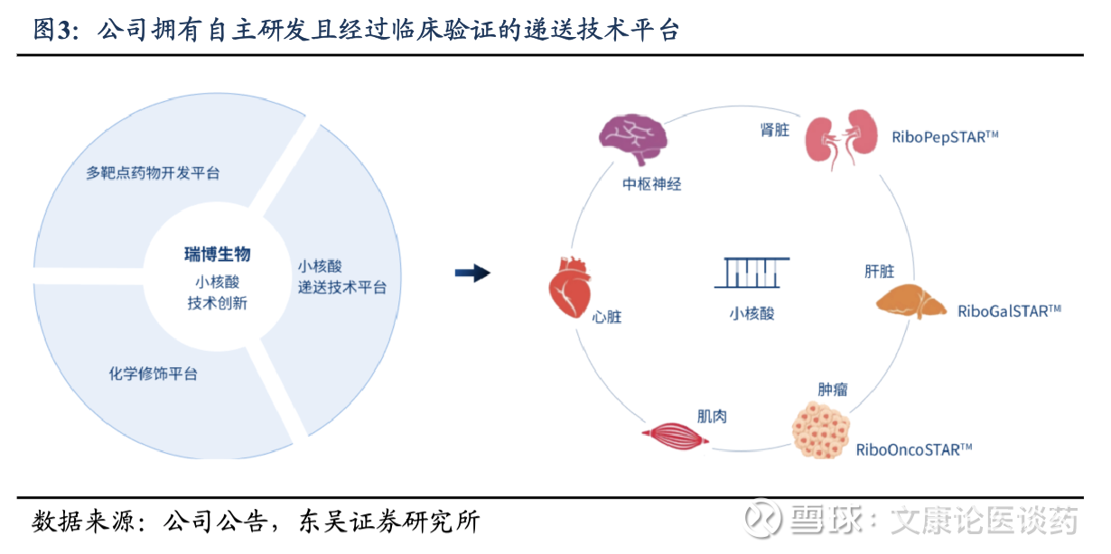 ◼ 中国小核酸领域龙头企业,自研技术具备全球竞争力:公司成立于2007年,专注于siRNA新药研发,聚焦多个患者众多的慢性疾病领域,是全球为数不多拥有自主知识产权的、且经过临床验证的GalNac递送技术的企业,其RiboGalSTAR™技术平台已与勃林格殷格翰建立战略合作伙伴关系,有望获得最高23.6亿欧元的里程碑付款;肝外递送技术的拓展大幅提升了公司的天花板上限。公司拥有RiboOncoSTAR™和RiboPepSTAR™两大肝外技术平台,处于全球小核酸药物开发头部企业的前沿。