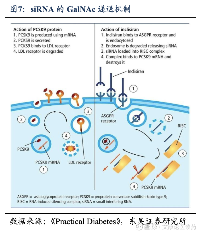 Galnac递送机理:siRNA由于分子量大(~14千道尔顿)、自身负电荷阻止通过细胞膜,因此需要专门的递送系统来克服其固有的挑战,目前肝靶向递送主要有N-乙酰半乳糖胺(GalNAc)偶联物、脂质纳米颗粒,以及基于聚合物的载体。递送系统旨在保护循环中的siRNA,促进细胞进入,实现内体逃逸,或实现对特定组织的靶向递送。GalNAc偶联物已成为临床上成功用于siRNA疗法的肝靶向递送系统。这种方法利用了去唾液酸糖蛋白受体(ASGPR)在肝细胞上的高表达,实现了受体介导的内吞作用。GalNAc-siRNA 偶联物具有高效、安全性好、效果持久等优势。