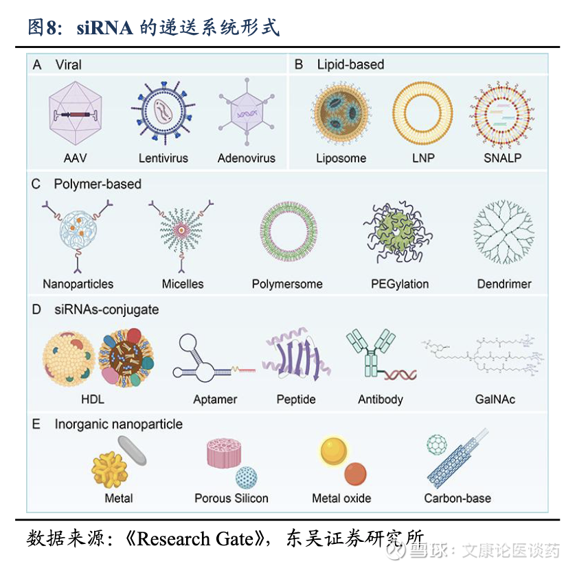 小核酸是化学合成的、短的(通常为 15-25 个核苷酸)核酸序列,用于调节基因表达水平,进而调控相应的蛋白质功能,是通过mRNA转录水平调节达到治疗疾病目的一种直接方法。小核酸药物主要包括1)小干扰RNA(siRNA),是短双链RNA分子,当作为外源性治疗药物递送至细胞内时,可通过激活细胞内源性RNA干扰(RNAi)机制特异性降解靶标mRNA,已成为小核苷酸药物研发的前沿领域。其强大的靶基因特异性沉默能力,加上能够靶向过往不可成药靶点的潜力,使其成为治疗从罕见遗传病到慢性疾病及癌症等多种疾病的有效工具。2)反义小核酸(ASO),是单链RNA或DNA分子,可以和互补mRNA结合,通过多种机制调节蛋白质水平及功能。3)适配体,折叠形成特定的三维结构,以高亲和力和特异性结合靶标蛋白,从而阻断蛋白功能。