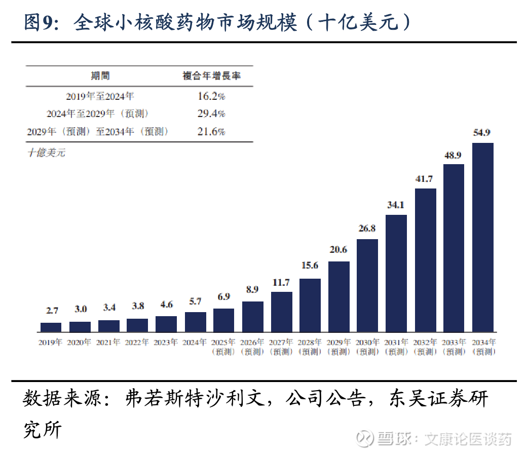 ◼ 小核酸药物技术突破,慢病领域潜力无限:小核酸药物主要优势为靶标可及性广、靶向性/特异性强、研发效率高、给药间隔长,在精准靶向的同时,显著提升慢病患者依从性,打开潜在临床需求。根据弗若斯特沙利文,2024年全球小核酸药物市场规模57亿美元,至2033年预计将达549亿美元,2024-2034年CAGR为21%-29%,进入发展快车道。公司作为国内龙头小核酸领域,将技术壁垒兑现为商业化价值。