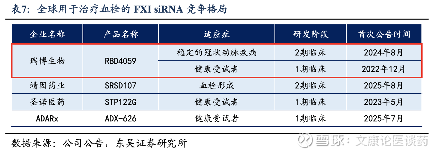 公司FXI siRNA具备FIC潜力:截至2025年底,各种靶向FXI的治疗方式正在临床开发中,包括小分子、抗体和小核酸,目前均未获批;全球共有4款用于治疗血栓性疾病的靶向FXI siRNA候选药物正在临床开发阶段。公司RBD4059(FXI siRNA)是全球首款用于治疗血栓性疾病的临床阶段的siRNA药物。
