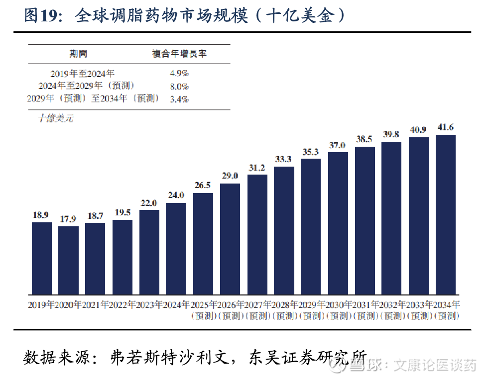 2026年血脂异常影响全球30亿人,药物市场规模达290亿美金。血脂异常是一种以血液中任何或所有脂质(如甘油三酯、胆固醇、磷脂)或脂蛋白水平异常为特征的疾病。在全球范围内,成人血脂异常的患病率估计约为40%,每年影响约30亿人。根据弗若斯特沙利文,2024年,全球血脂异常患病人数达到3,221.6百万人,预计2034年将增至3,672.5百万人。基于如此庞大的患者群体,全球调脂药物市场规模从2019年的189亿美元增长至2024年的240亿美元,预计至2034年将达416亿美元, 2024-2029年CAGR为8.0%,2029-2034年CAGR为3.4%。