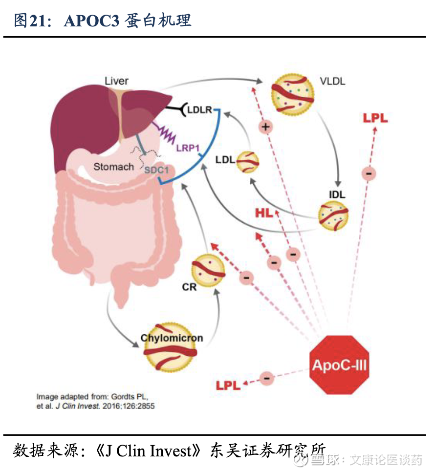APOC3靶点机理:载脂蛋白C3(APOC3)是体内脂质代谢的关键调节因子,当APOC3水平升高时,TG水平也会提升。APOC3破坏了正常的脂质水解和清除,主要通过1)LPL依赖性路径,抑制脂蛋白脂肪酶(LPL,一种负责分解TG的酶)以及2)LPL非依赖性路径,干扰肝脏清除富含TG的残余脂蛋白;这导致TG在血液中大量积累,造成HTG。APOC3 与TG代谢之间的密切联系使其成为治疗HTG的重要治疗靶点。