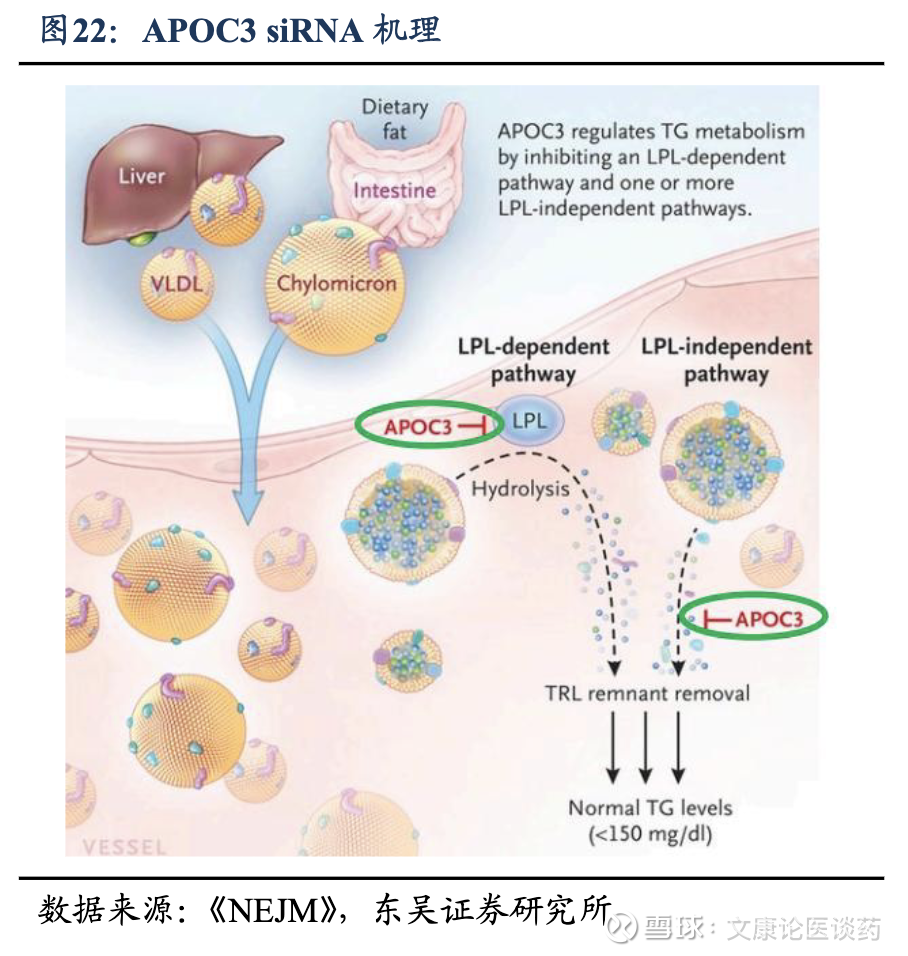 APOC3 siRNA有望实现调节血液TG的突破性效果。APOC3靶向疗法通过直接抑制脂质代谢的关键调节因数,已成为一种突破性治疗策略。靶向APOC3的siRNA疗法通过特异性靶向APOC3 mRNA,可以有效降低APOC3蛋白水平,从而消除其对脂质代谢关键酶(如脂蛋白脂肪酶)的抑制作用,并提高富含TG的脂蛋白的清除率。APOC3靶向药物有利于治疗选择有限或对现有疗法反应不足的重症HTG患者,并且可与现有疗法互补,具有潜在的临床应用价值。同时,siRNA的持久药理活性使其能够通过每季度或每半年一次的给药方案,实现长期的TG控制,显著提高了患者依从性。