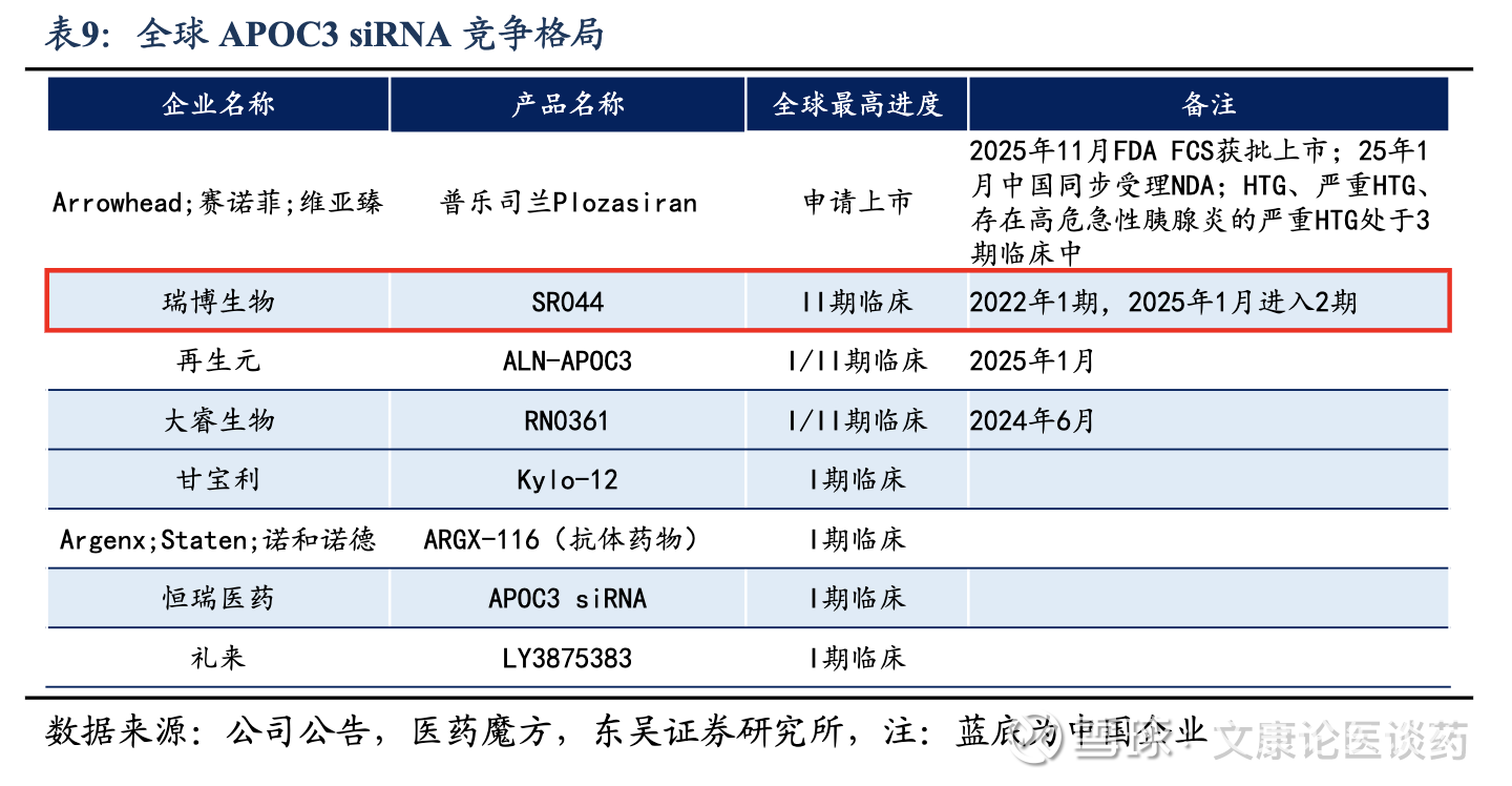 公司APOC3 siRNA国内进度TOP1、全球进度TOP2:截至2025年底,全球仅有3款靶向APOC3的小核酸药物获批上市,其中volanesorsen及olezarsen是ASO类药物,以及plozasiran是siRNA类药物,均获批用于治疗家族性乳糜微粒血症综合征(FCS,由乳糜微粒代谢缺陷引起的一种罕见的遗传性严重HTG)。他们的获批证明了APOC3作为治疗靶点在重症HTG中的临床有效潜力。截至2025年底,全球有8款靶向APOC3治疗HTG的siRNA候选药物正在进行临床开发,公司的RBD5044(APOC3)处于国内TOP1、全球TOP2的研发进度。