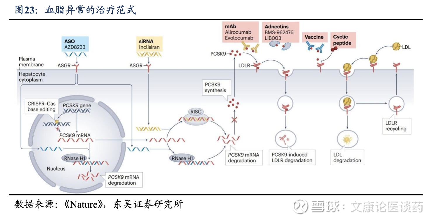 HC治疗策略:过往的一线药物是他汀类药物,根据心血管风险评估和降低LDL-C的目标选择药物用量;目前靶向疗法包括PCSK9靶向药物(例如默克的口服大环肽抑制剂MK-0616、阿斯利康的口服小分子抑制剂AZD0780以及瑞博生物的PCSK9 siRNA),脂蛋白 (a) 靶向疗法(例如安进/Arrowhead的siRNA候选药物olpasiran),及靶向血管生成素样蛋白 3(ANGPTL3)的疗法(例如礼来公司的siRNA候选药物solinisiran)。