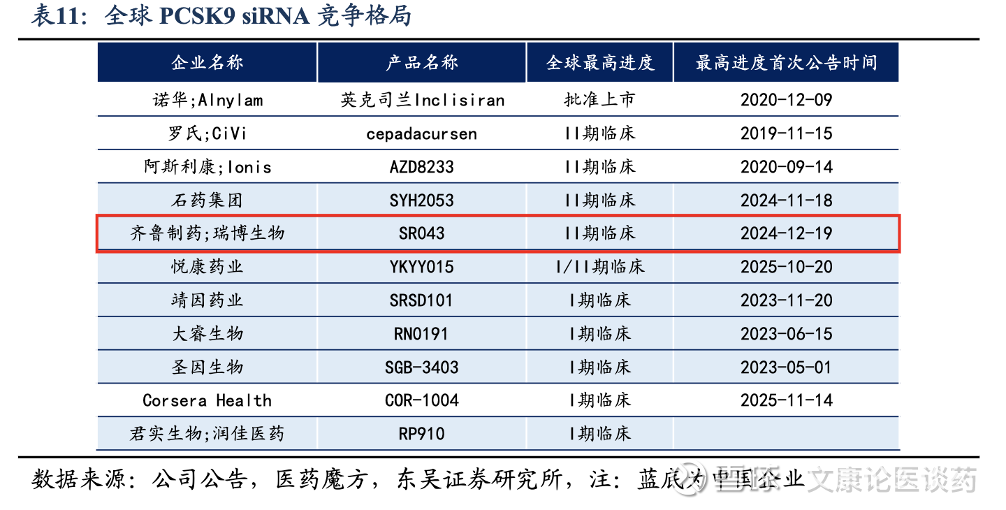 公司PCSK9 siRNA整体进度领先,相较Inclisiran有更加长效的优势:截至2025年底,诺华/Alnylam的Inclisiran是全球唯一获准治疗高胆固醇血症的靶向PCSK9 siRNA,每3个月给药一次,其2024年全球销售额达7.54亿美元。公司RBD7022(PCSK9 siRNA)在全球临床开发的siRNA候选药物中跻身临床进度最快的药物之列。公司已于2025年3月完成受试者1期临床试验,初步结果显示,RBD7022具有强效性及长效性,支持每6个月一次的给药频率。