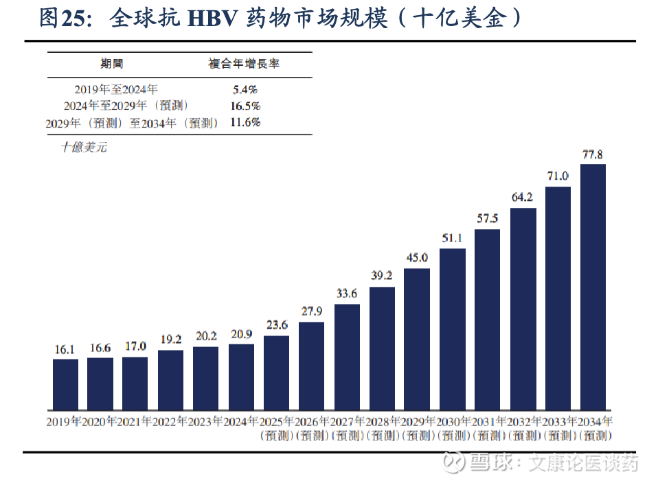 2026年全球HBV感染者约2.8亿人,抗HBV药物市场规模约25亿美金。根据弗若斯特沙利文,2026年全球约有2.79亿名感染者;全球抗HBV药物市场规模从2019年的161亿美元增长至2024年的209亿美元,期间CAGR为5.4%,预计至2034年将达778亿美元,2024-2029年CAGR为16.5%,2029-2034年CAGR为11.6%。