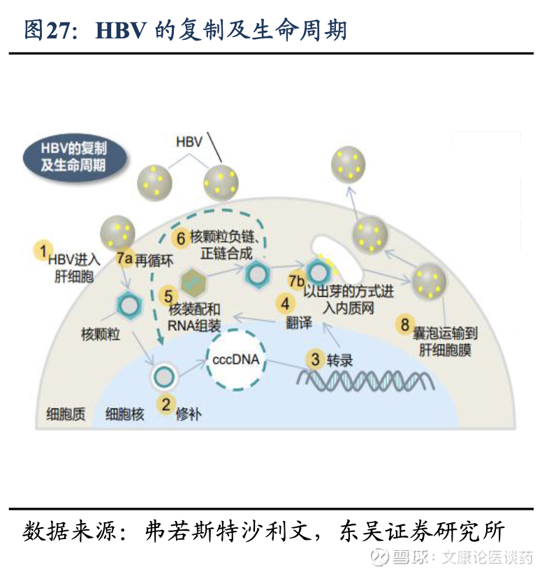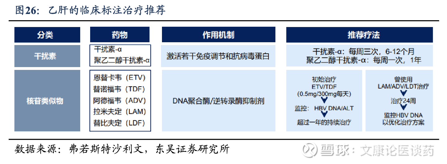 CHB治疗策略:目前商无针对CHB的有效实现功能性治愈方法,功能性治愈通常定义为伴有或不伴有抗HBs血清转化的持续HBsAg丢失。临床标准治疗推荐核苷(酸)类似物(NAs)或干扰素的抗病毒疗法,并在治疗过程中监测疾病进展。NAs,如恩替卡韦、替诺福韦和拉米夫定,通过直接抑制HBV DNA聚合酶发挥作用,从而减少病毒复制。它们通常具有良好的耐受性,可以口服,使其成为大多数 CHB 患者首选的一线治疗方法。以干扰素为基础的疗法,特别是聚乙二醇化干扰素-α(PegIFN-α),可刺激免疫系统对抗病毒,同时具有抗病毒和免疫调节作用。