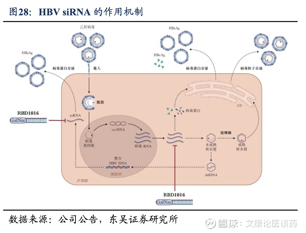 HBV siRNA药物作用机理:HBV感染肝细胞后,其基因组生产病毒mRNA,mRNA编码关键的病毒蛋白,包括乙型肝炎表面抗原(HBsAg)、乙型肝炎e抗原(HBeAg)和 HBV DNA 聚合酶,所有这些蛋白在病毒复制、传播和免疫逃避中都起着至关重要的作用。抗HBV siRNA药物通过直接干扰HBV病毒RNA转录物的序列特异性结合,抑制HBsAg、HBV DNA和HBeAg的产生。