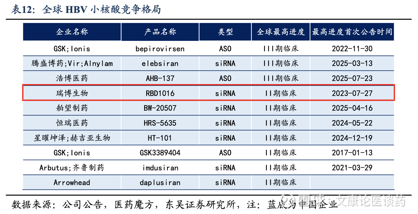 公司HBV siRNA已经进入2期全球MRCT临床,进度较快。截至2025年底,全球尚未批准任何siRNA药物用于治疗CHB,全球共有7款HBV siRNA进入2期临床试验及以上阶段。公司的RBD1016(HBV siRNA)目前已经进入2期全球MRCT,研究的主要终点是安全性以及从基线到随访期第24周HBsAg水平的最大降幅(log值)。公司已完成该实验,最后一位患者的末次试访已于2025年10月完成,正在进行最终的数据分析;同时公司也在探索RBD1016用于治疗丁型肝炎(CHD)的潜力,已于2024年8月在瑞典启动2a期试验,公司预计于2026年底前完成该试验。