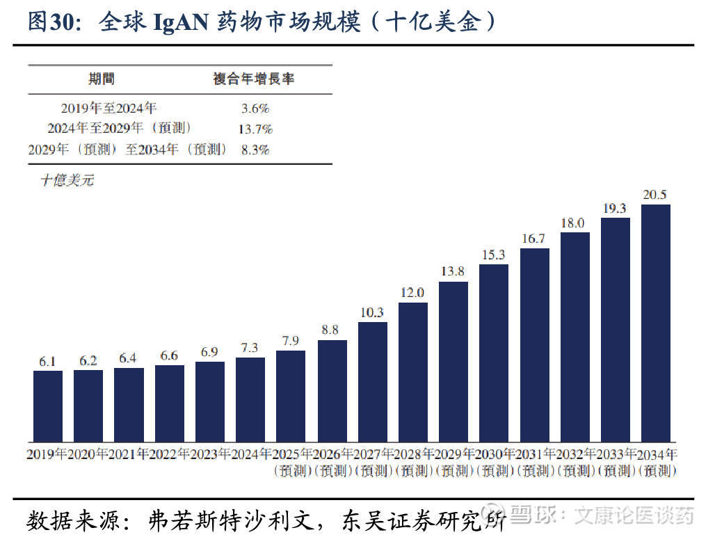 2026年IgAN全球患者约980万人,药物市场规模约88亿美金。根据弗若斯特沙利文,2024年全球约有960万人受到IgAN的影响,预计2034年将达到1,040万人;全球IgAN药物市场规模从2019年的61亿美元增长至2024年的73亿美元,期间CAGR为3.6%,预计至2034年将达205亿美元,2024-2029年CAGR为13.7%,2029-2034年CAGR为8.3%。
