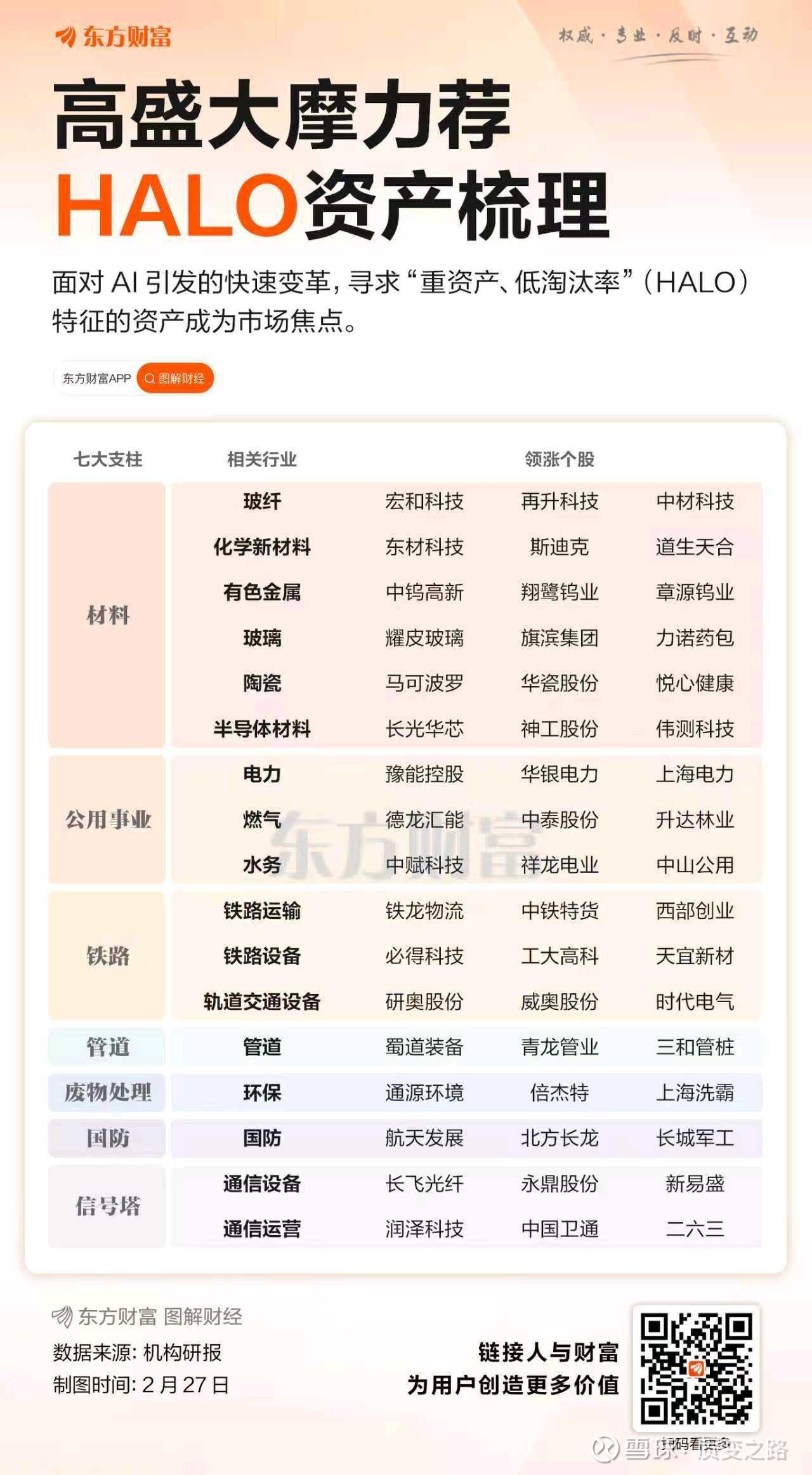 2月24日,高盛全球投资研究部发布最新报告《HALO影响力:AI领域的重资产、低淘汰》(The HALO effect: Heavy Assets, Low Obsolescence in the AI era)提出:在更高实际利率、地缘政治碎片化、供应链重构与AI资本开支浪潮叠加之下,股市的核心定价逻辑正在从“可扩张的轻资产叙事”,转向“可建造、难替代的实体产能与网络”。
