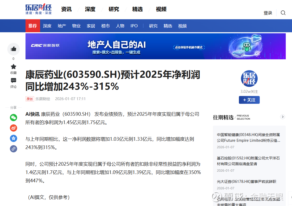 不少媒体的标题都是这样的:“康辰药业预计2025年净利润同比增长243%-315%”“业绩爆发式增长”……具体报道中则引用了公告数据:预计2025年实现归母净利润1.45亿元到1.75亿元,同比增加1.03亿元到1.33亿元,增幅243%到315%;扣非净利润1.4亿元到1.7亿元,同比增加350%到447%。