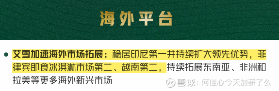 艾雪团队在国外“走街串巷”、 “啃最硬骨头”的奋斗精神,早期蹬自行车跑农村,住进当地村庄,根据口味偏好研发产品,免费向中小商店投放近百万台冰柜并补贴电费,成为被当地人认可的“自己人的品牌”,甚至有店主为孩子取名Aice。他们的创业故事真的让我刮目相看,如果是单独上市的公司,我一定会投资这家公司。
