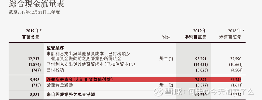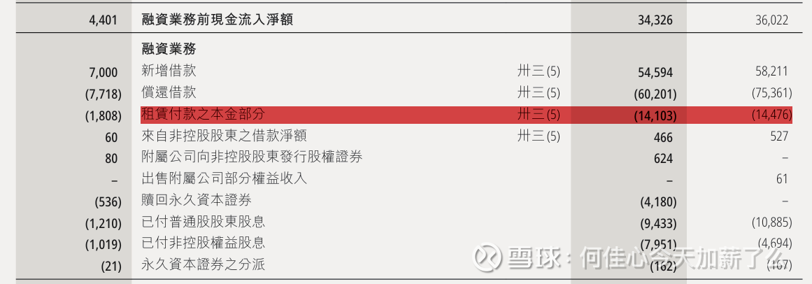 因此,从长和的年报中我获取到了两个关键信息,利息支出及其他融资成本已经被经营性现金流扣除过了,而租赁本金19年开始从经营性现金流移到了融资性现金流。