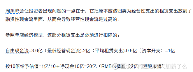 这也是为什么我没有投资周黑鸭的原因,因为很多投资人在计算周黑鸭的自由现金流时,忽略了藏在融资性现金流里面的租赁本金部分导致自由现金流过高。