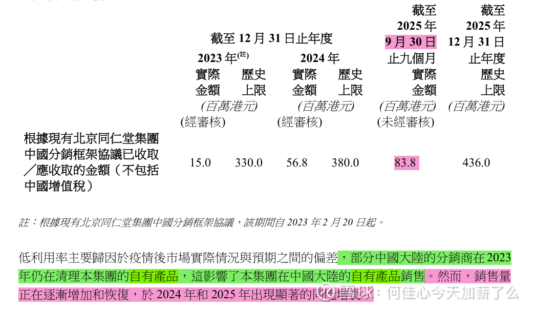 在这里我提取到的关键信息是:截止25年三季度,母公司同仁堂的销售金额达到了0.83亿,预估25年全年最低1亿,相较于24年0.57,同比增长接近100%;且在年报中管理层也说明了25年销售量正在恢复,出现了显著的同比增长,这是很好的消息!