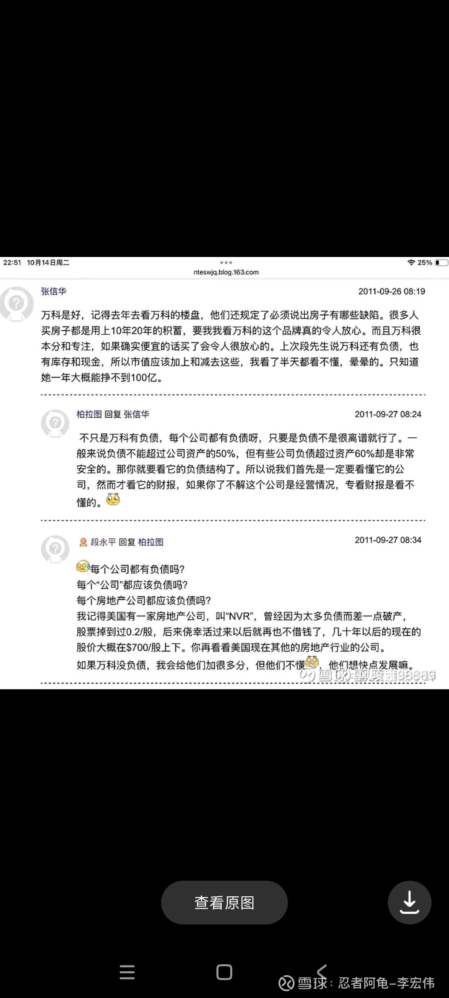回复@大道无形我有型: $NVR(NVR)$ 大道提到的没有杠杆的房地产,难道地产就必须杠杆么?反过来想。独立思考任何时候都很重要。大家买房我就也要买房么,大家上大学,我就也必须上大学么,大家做牛马我也必须做牛马吗。其实人生多问自己,与自己对话,找到属于自己的答案。征求他人的建议,肯定得不到正确的答案。查看图片//@大道无形我有型:回复@本分做事情:哈,2012年的时候有个还算蛮有名的房地产商来“讨教”,我跟他说,你们债务太高了。他说,我们这个行业都这样,我的算低的了。我说出事的时候,有人从三十楼跳下来,你觉得你从十五楼跳下来会更安全吗?(大致意思)。他现在大概率不行了,不知道会不会后悔当年没听我的。那个时候如果他想救自己是来得及的。逻辑真是个好东西啊。