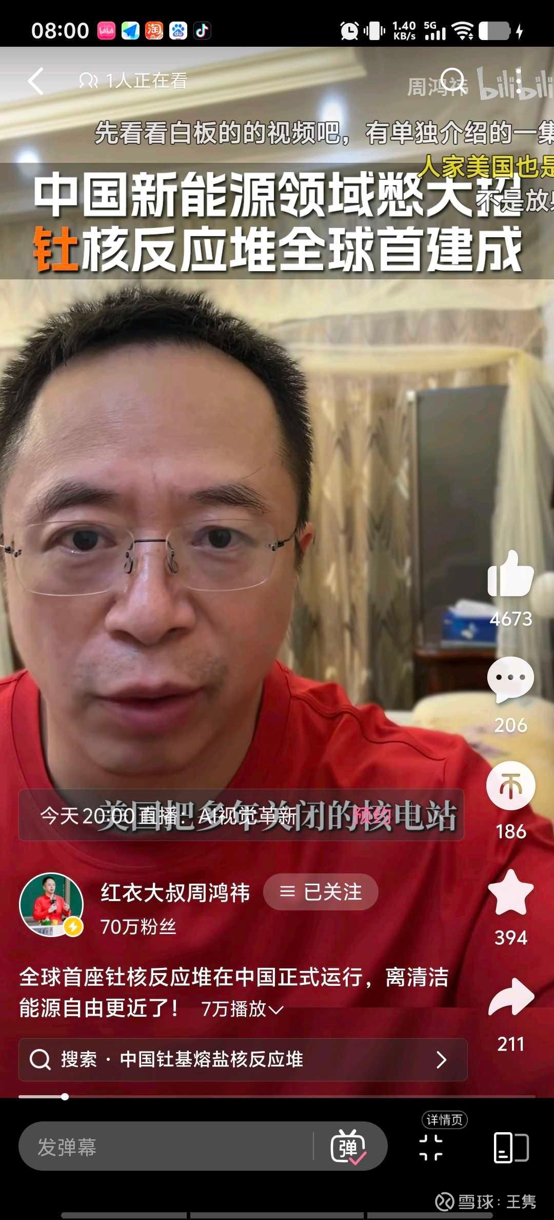 大叔念稿:【全球首座钍核反应堆在中国正式运行,离清洁能源自由更近了!-哔哩哔哩】 网页链接